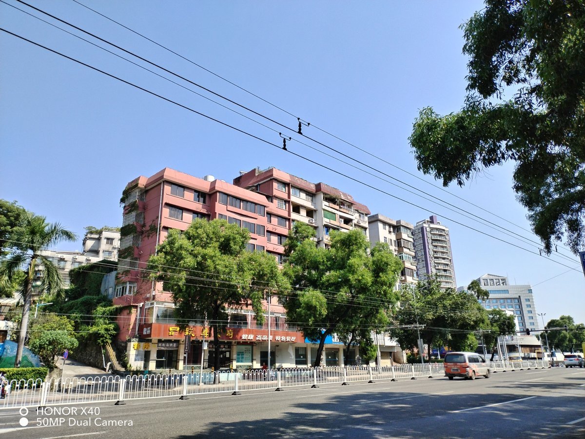从实际的样张表现上看,荣耀X40 的主摄色彩还原还是比较不错的,几乎能还原肉眼的观感,但清晰度表现一般,建筑还是比较清晰的,但是放大树木就有很明显的抹布感,有一种像是虚化了的感觉。