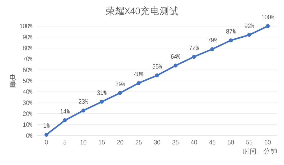 荣耀X40配备40W超级快充,相比于上一代的 66W 快充来说也是有一点遗憾的,实测充电 5 分钟可以从 1% 充到 14% 电量,26分钟充至 50%,最后在 1 小时 4 分钟充至 100% 电量。这个充电时间对于有续航焦虑的我来说是不太满意的,但毕竟是一块 5100mAh 的大电池,如果能延续上一代的 66W 快充那就更好了。