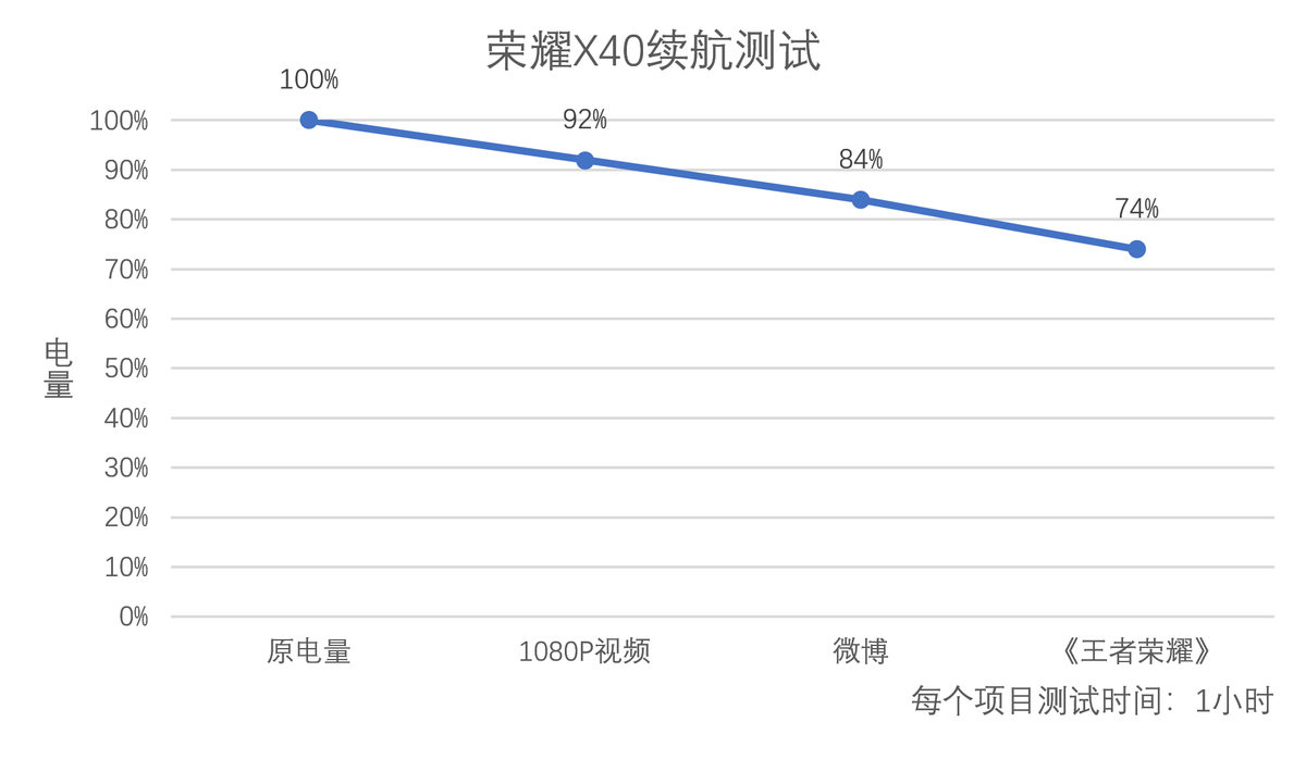 荣耀X40配备一块 5100mAh 大电池,看到这个数字就让我非常有安全感。实际的续航表现我们也实测了一下,一小时微博耗电8%、一小时 1080P 视频播放耗电 8%、一小时《王者荣耀》耗电10%,最后剩余电量 74%。这个续航能力算是中等偏上吧,在微博、视频等这些日常使用下确实感受到了电池的耐用性,但在游戏上的续航就比较一般了。