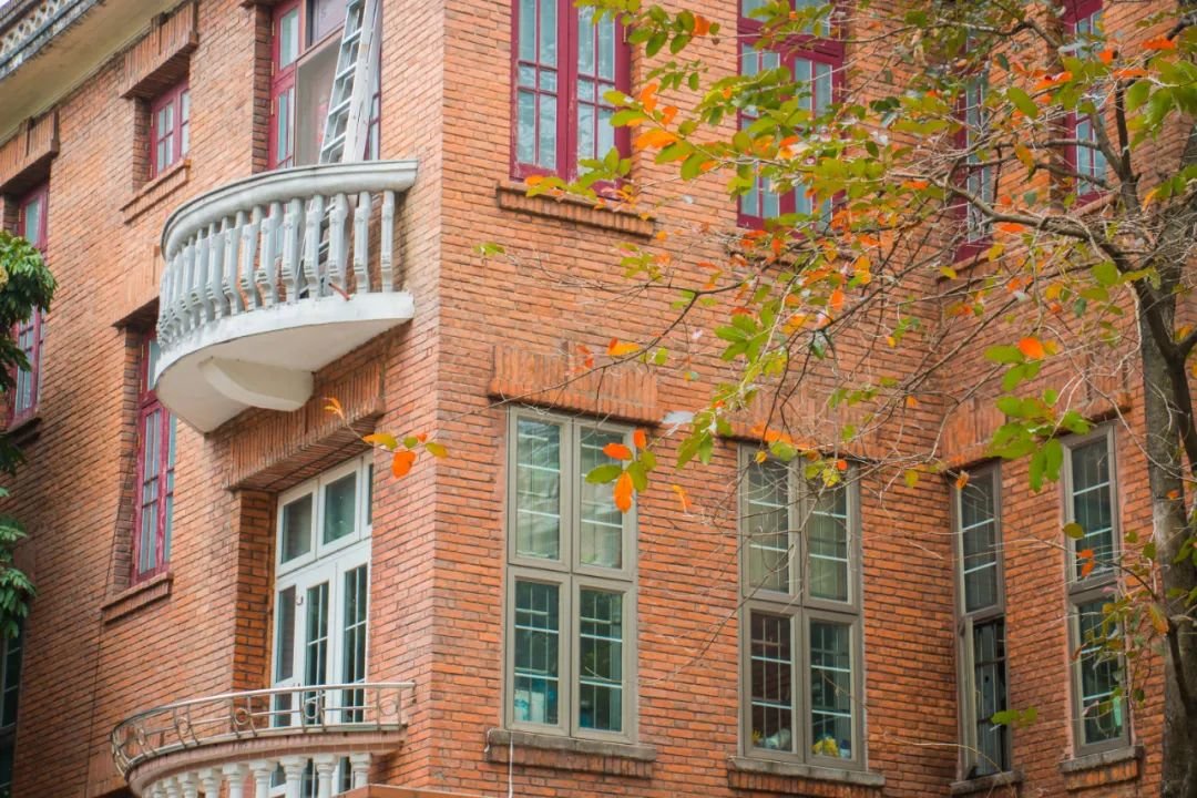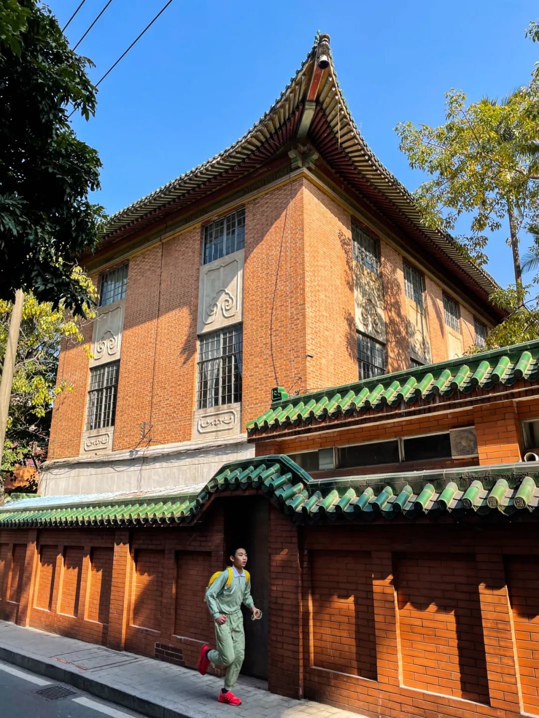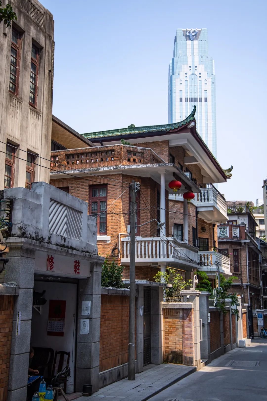 郁郁葱葱的参天古树两旁,分布着以红砖清水墙、柱式门廊、民国水刷石、