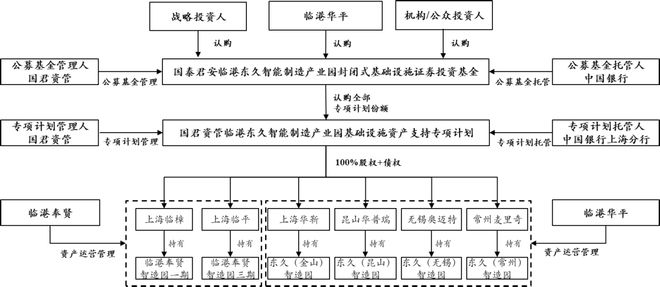 临港集团参与的临港奉贤智造园一期和临港奉贤智造园三期两个项目作为国泰君安临港创新智造产业园REIT;剩余的东久(金山)智造园、东久(昆山)智造园、东久(无锡)制造园和东久(常州)智造园装入国泰君安东久新经济产业园REIT,由发改委报送证监会审核。