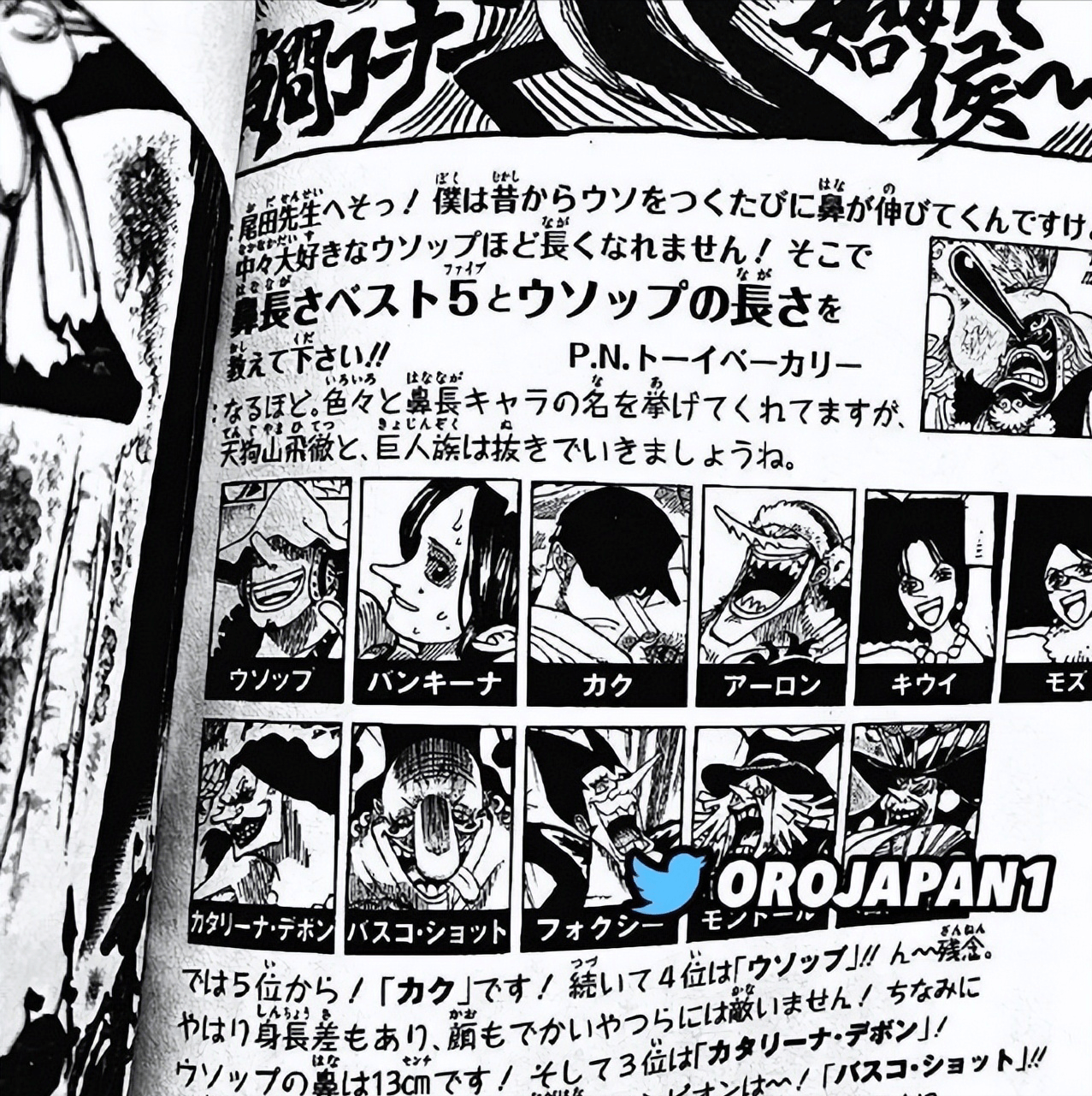 这里就有一个问题了,大家都知道乌索普的鼻子很长,那你知道它究竟有多长吗?这不,在《海贼王》刚刚发布的漫画102卷单行本的SBS环节中,有为粉丝就向作者尾田询问了乌索普鼻子的长度,还让尾田告诉他作品里鼻子长度TOP5的角色。