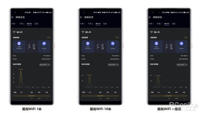 我们也实测了分别在随身WiFi 1米、10米以及一堵墙阻隔距离下的WiFi信号强度,三者信号强度均在-70dBm内,属良好范围,dBm的数字越小就表示信号越好。