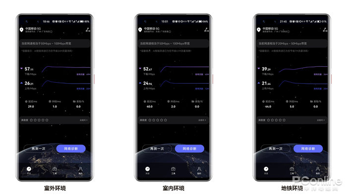 速度快否是检验随身WiFi性能的重要因素之一,笔者用第三方测速APP进行简单测试, 分别在室内、室外以及地铁等地下环境进行测试。