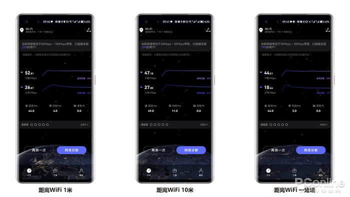 信号也是检验一款随身WiFi性能的又一重要因素,得益于飞猫智联U8内置了三根高增益的3D立体式LDS天线,让4G网络更加稳定可靠不掉线。距离随身WiFi的距离也会影响网速,所以我们还测试了这款随身WiFi在WiFi连接下时的不同距离的网速表现,分别在随身WiFi 1米、10米以及一堵墙阻隔的距离下进行检测。