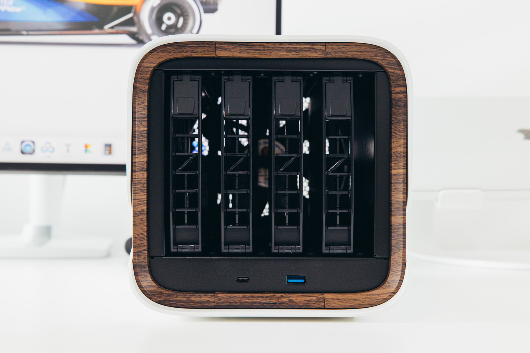 盖板下是四个快拆硬盘支架,底部隐藏了一个USB-C接口以及一个USB-A 3.0接口,同时还具备一颗LED氛围灯。