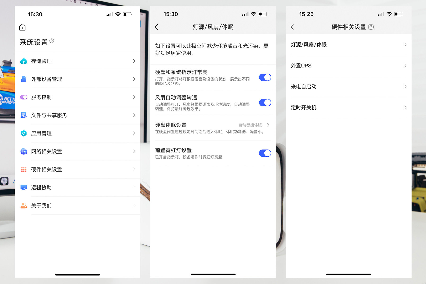 相对于传统NAS一堆晦涩难懂的设置,极空间Z4S的系统设置就简单明了多了,常见的指示灯、风扇调速、硬盘休眠、外置UPS、来电自启动和定时开关机APP中就可以搞定,无需打开PC或者网页客户端。