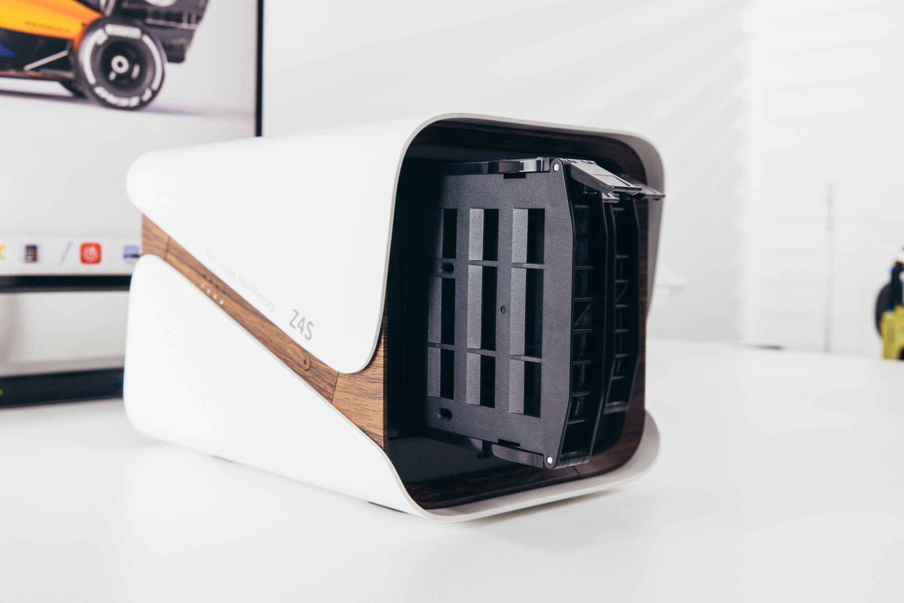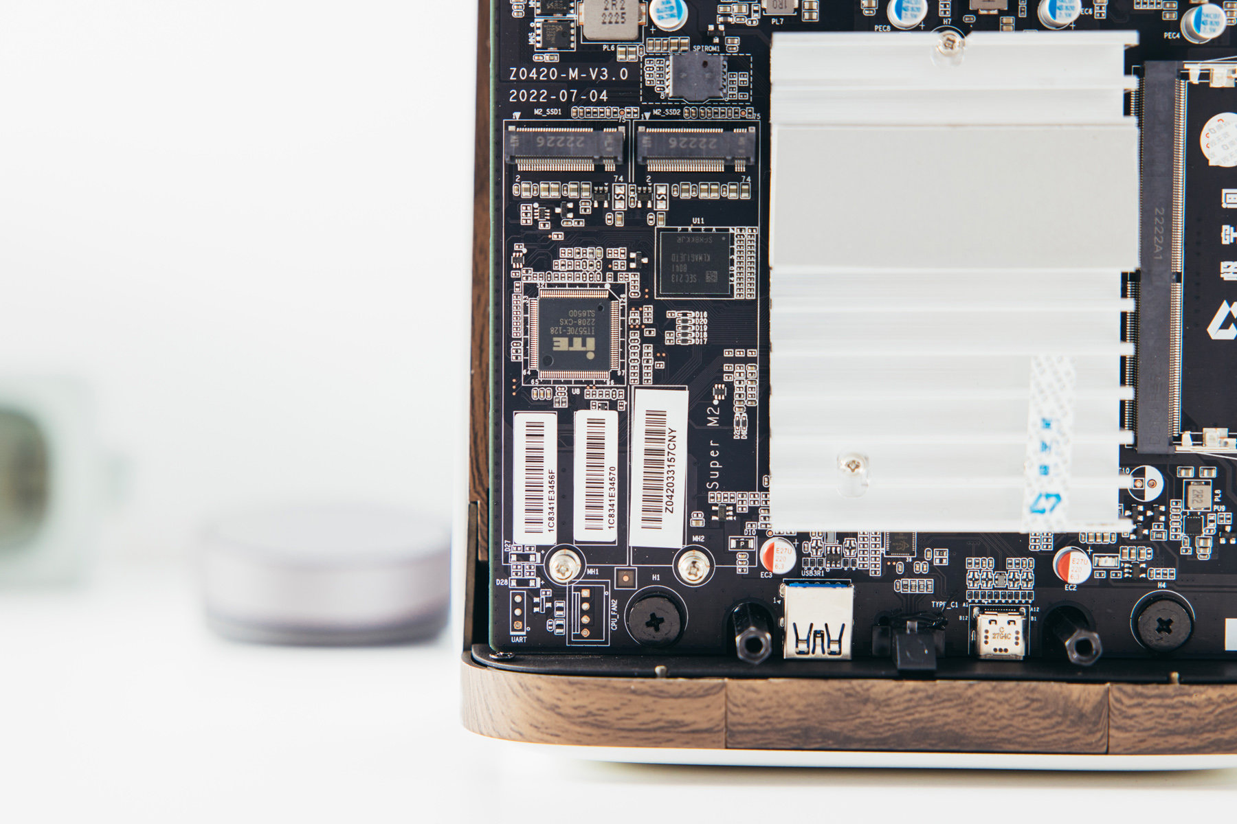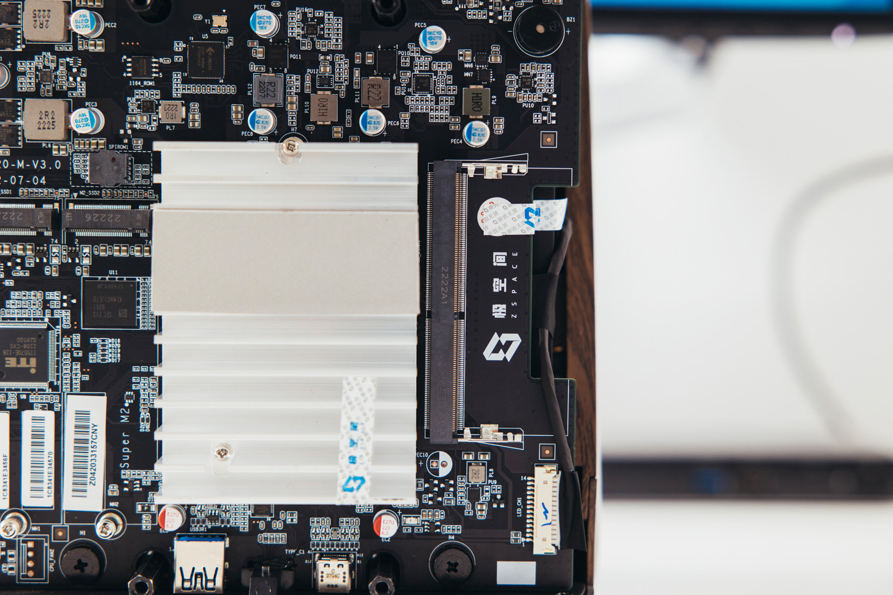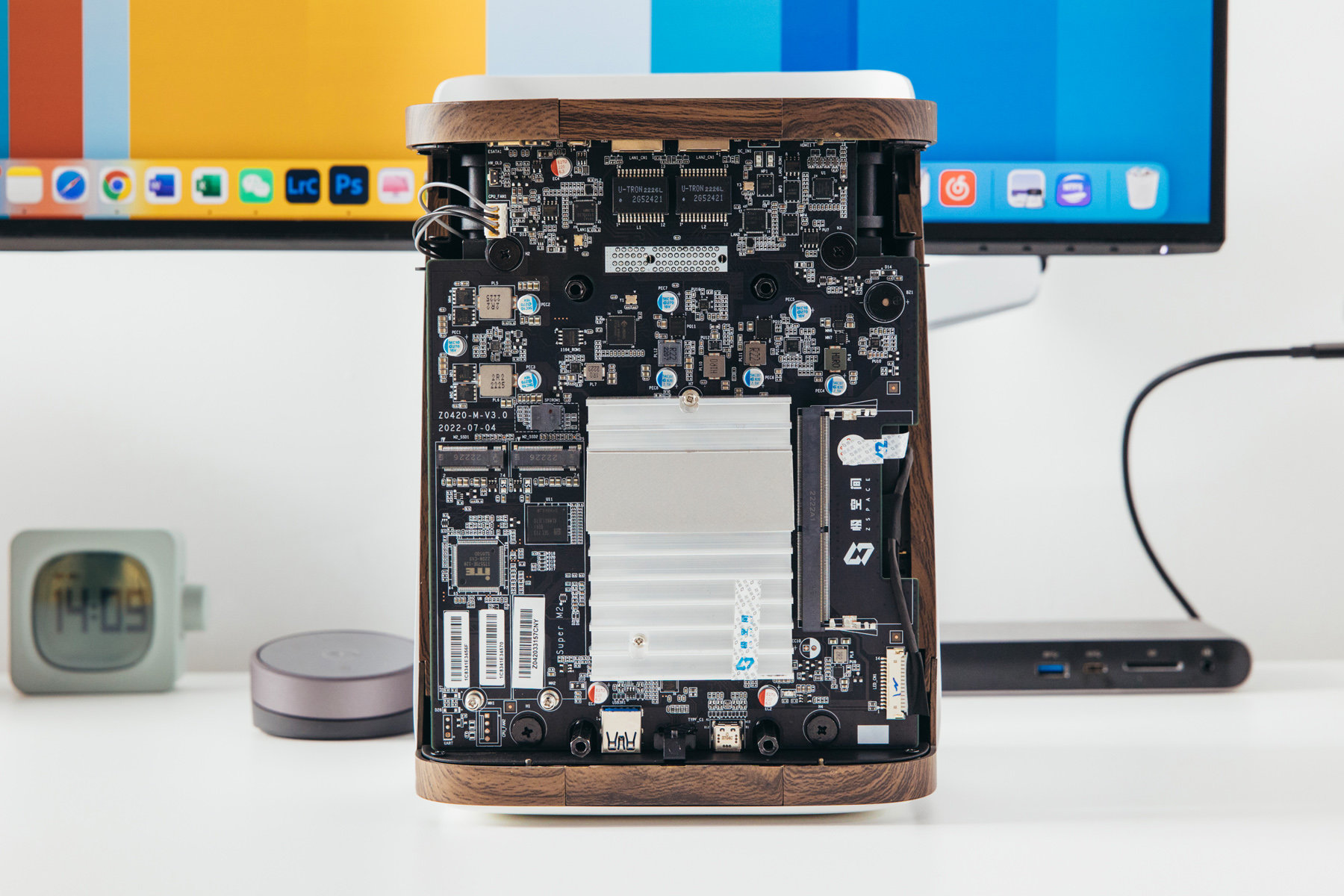 作为极空间目前的旗舰机型,Z4S的拓展性也非常不错,拆掉四颗螺丝就能看到内部的结构和主板以及芯片。