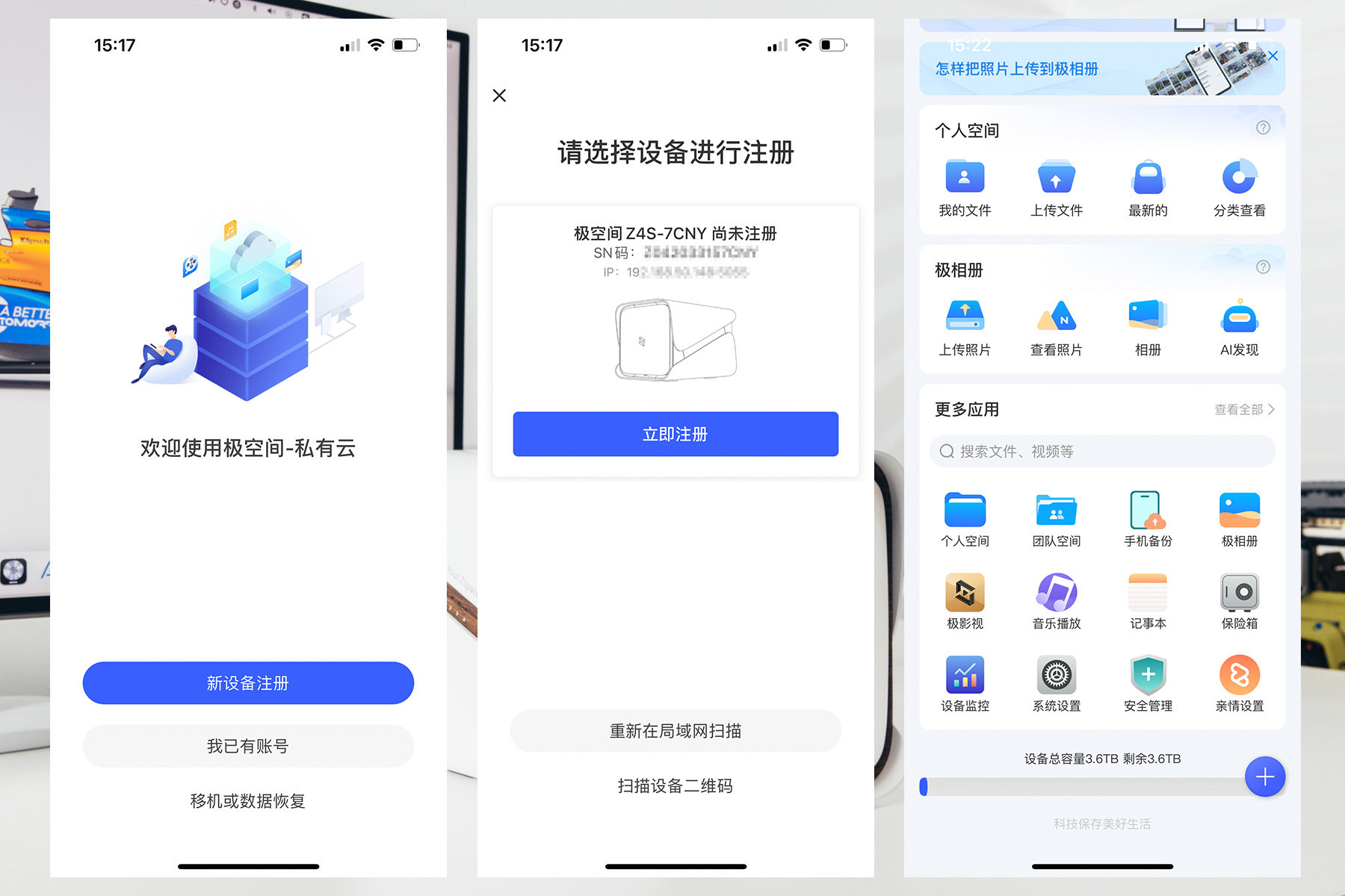 极空间Z4S的配置和账号注册全程靠一部手机就可以,无需打开电脑去配置。只要安装硬盘、接上网线和电源,开机,下载对应的APP就可以快速配置。