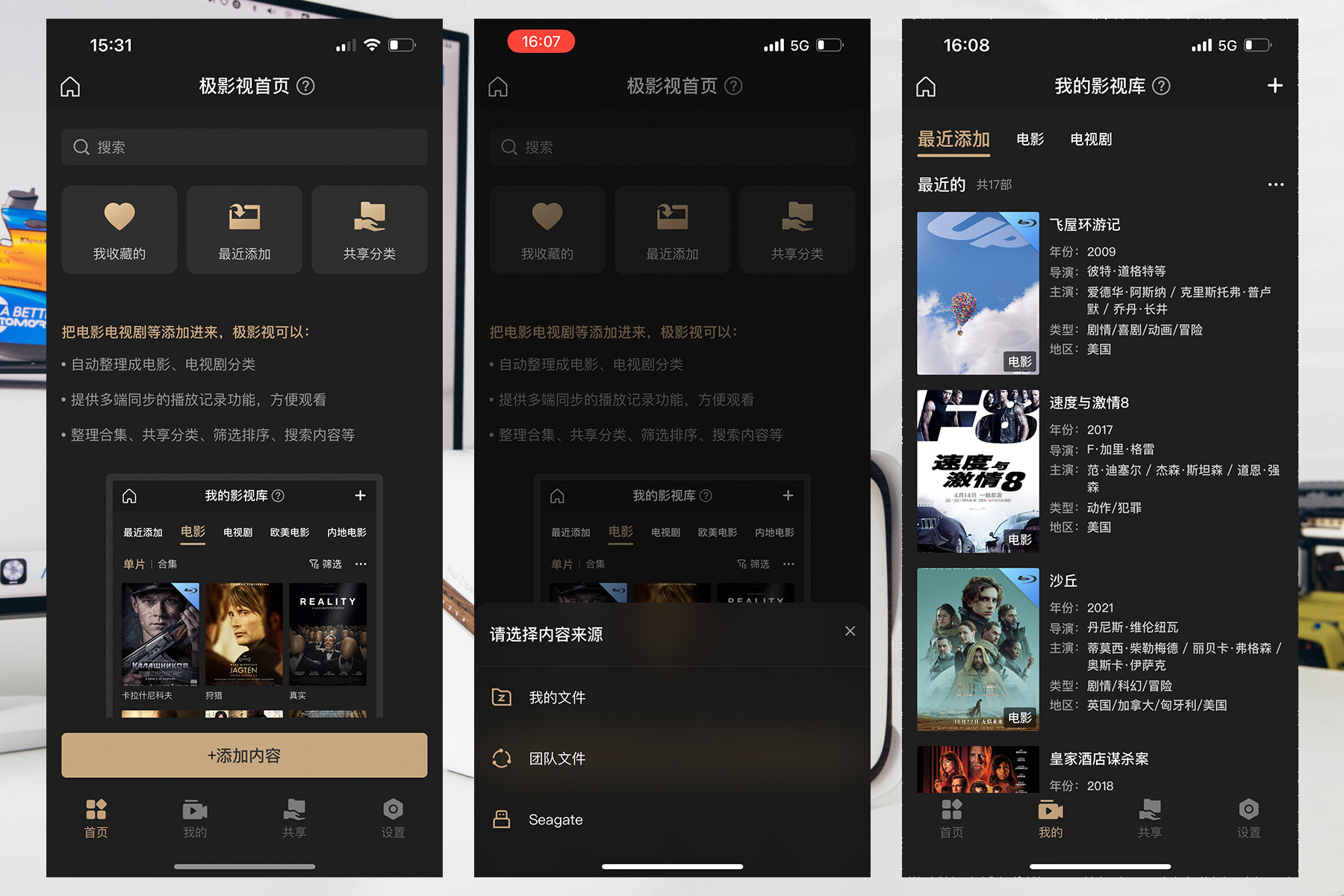 打开极影视,需要自己添加内容并且进行削刮,对于很多小白来说,电影大部分是放在移动硬盘里的,可以直接拷贝到NAS中,并且对其进行削刮,这个速度非常快,而且能精准识别出来海报信息,包括我此前的一些不能被APPLE TV+infuse Pro准确削刮的电影。
