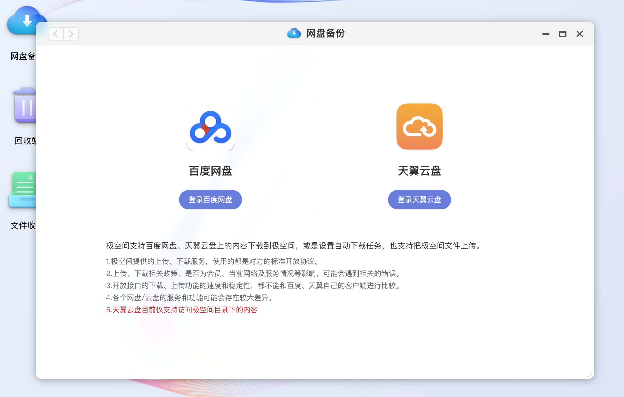 此外内置的百度网盘和天翼云盘也算是无缝链接了几乎最常见的云存储设备了,一些不太常用的文件、不是重要的数据可以直接在NAS中上传到百度网盘中,也可以作为刚拿到NAS的小白用户从百度网盘下载恢复数据用途。