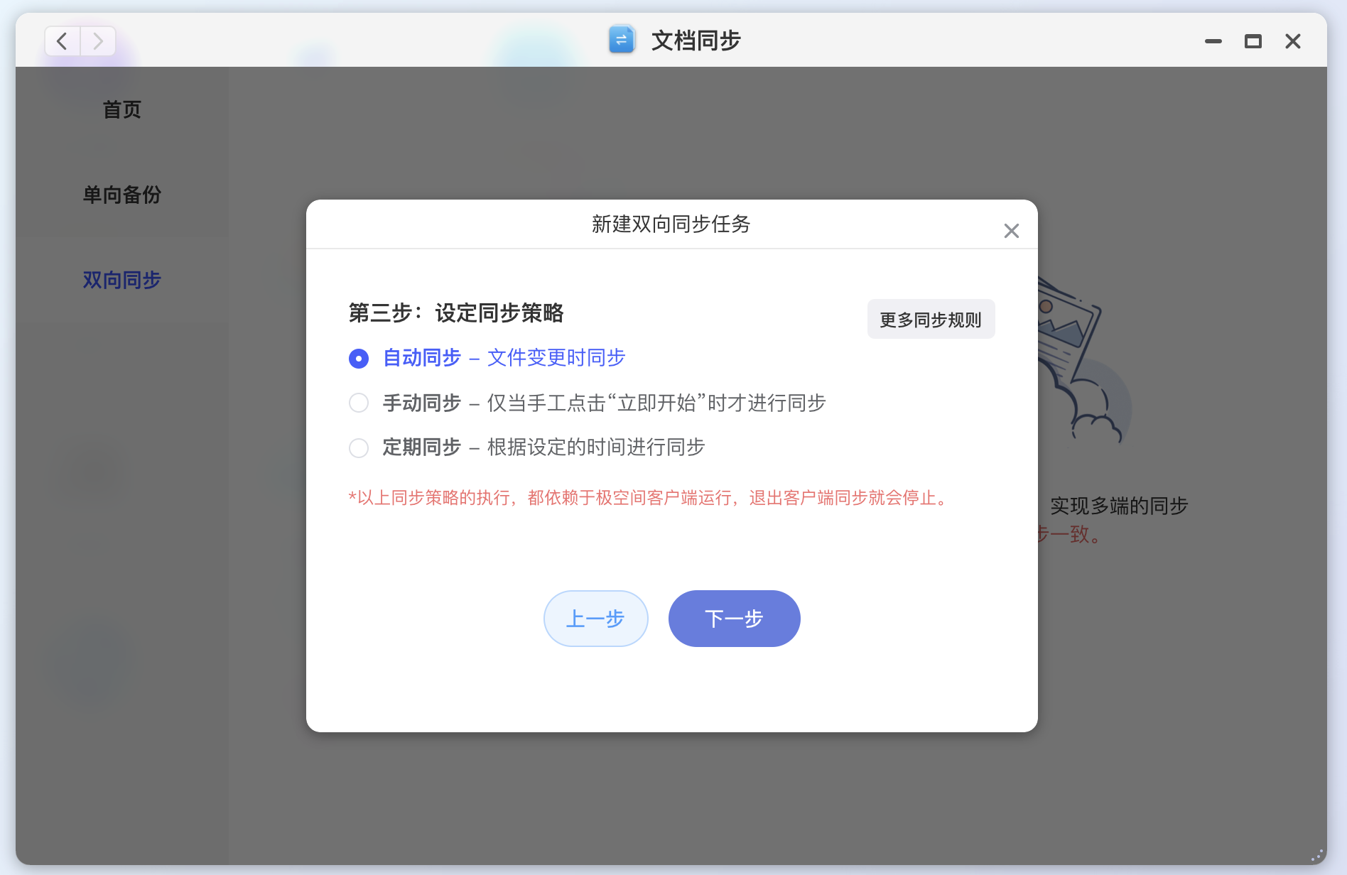 文档同步就是NAS总最常见的随时备份的功能了,支持双单向同步、设定同步策略以及规则。