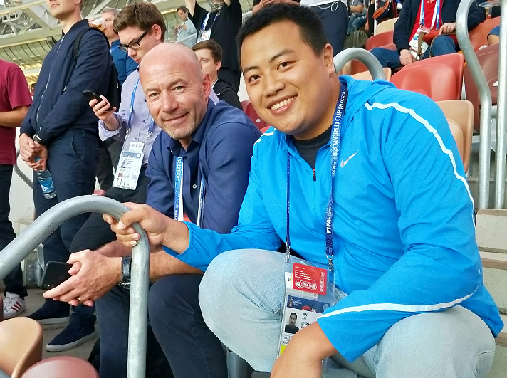 金鑫采访2018年俄罗斯世界杯时与英格兰名宿阿兰·希勒合影。