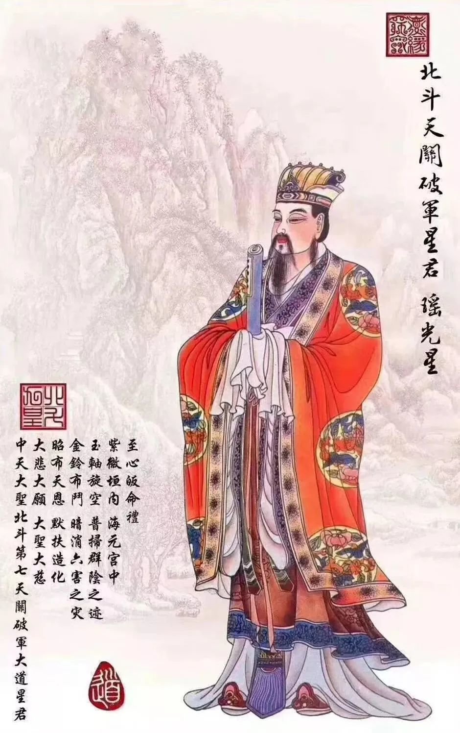 紫微垣内,海元宫中。玉轴旋空,普扫群阴之迹。金铃布斗,暗消六害之灾。昭布天恩,默扶造化。大悲大愿,大圣大慈,中天大圣,北斗第七天关破军大道星君。