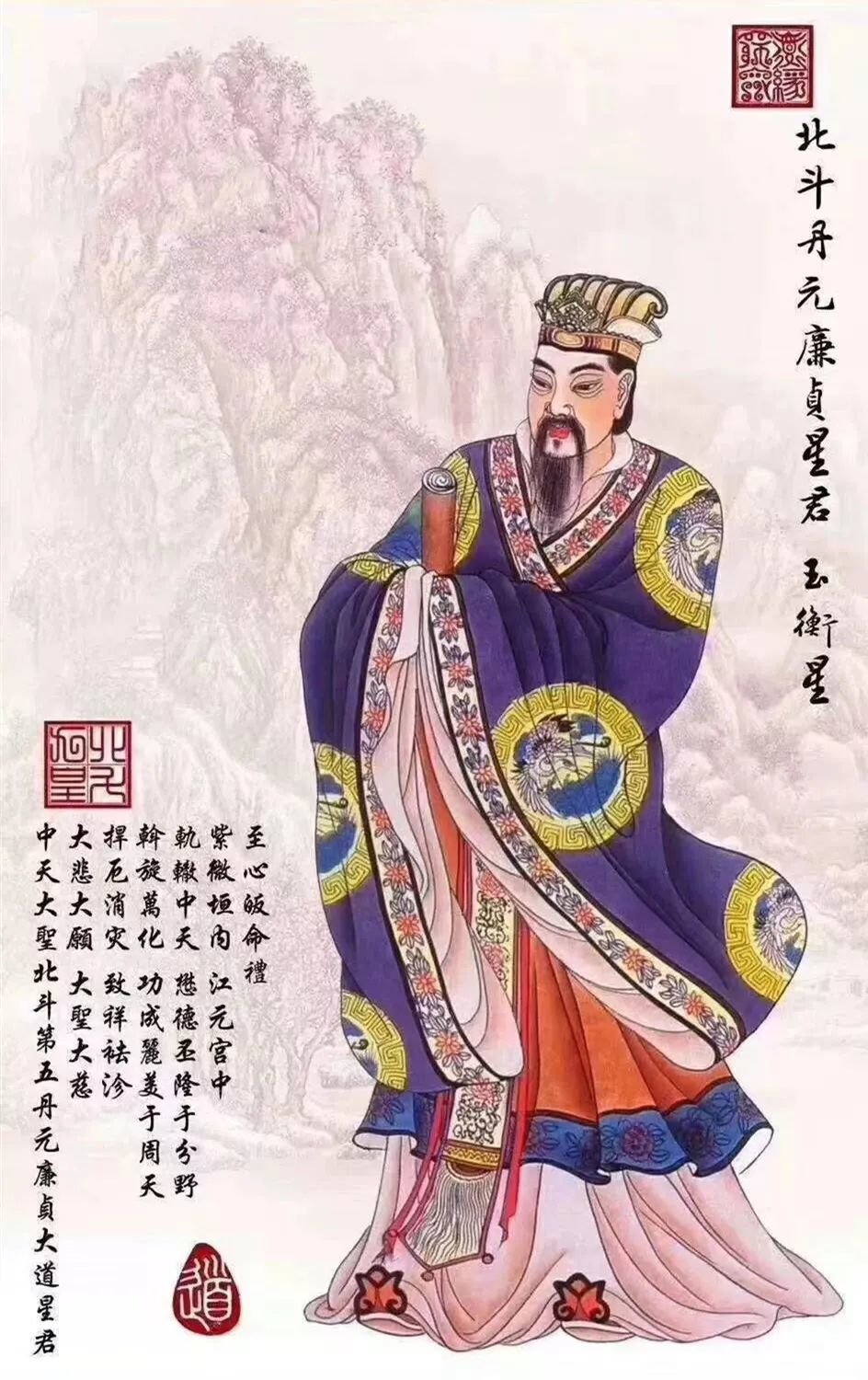 北斗第五丹元廉贞星君、玉衡星,五行为木,辰申生人属之。固身扶衰,长启吉祥。明真降佑,荡除凶殃。消灾自然,与神同乡。丹元星,天之斗君,上总九天鬼神,中领北帝三官,下监万兆黎民。诸以凶勃,莫不总该。化气为囚星,为官禄主。