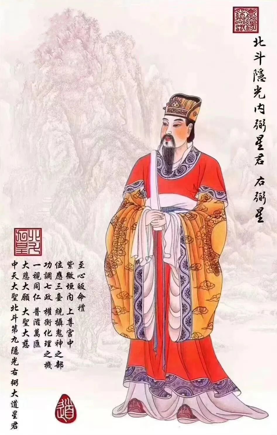 北斗第九右弼隐光星君。弼星如人间卿相,太常真星也,主财运生旺。右弼星君,乃斗中之内弼,总承财富,司察天下万国九州执政大臣罪福功过。