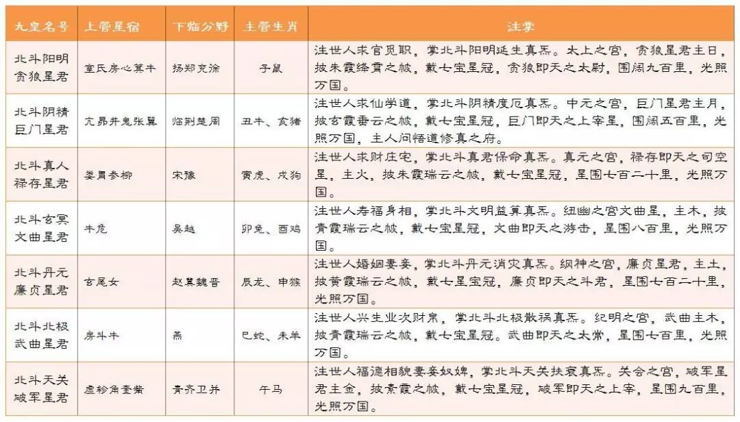 据《先天神后斗姆元尊大道九皇真经》载,北斗九皇星君名号,掌延生注死之籍,司福善祸淫之权。天子诸侯,公卿士庶,一切生命,均属斗宫。若有善男子,善女人,身遭老病,种种苦趣,但能悔罪消愆,诚心礼斗,诵此大道经训,燃点九皇神灯,照护命宫,自然转祸为福,化禄为祥,所有效验,不可具述。