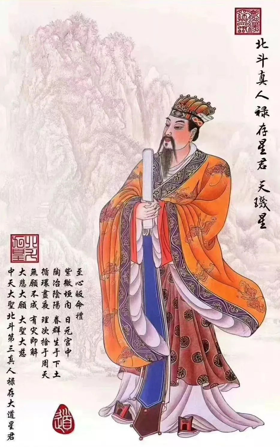 紫微垣内,日元宫中。陶冶阴阳,眷群生于下土。循环昼夜,理次舍于周天。无愿不成,有灾即解。大悲大愿,大圣大慈,中天大圣,北斗第三真人禄存大道星君。