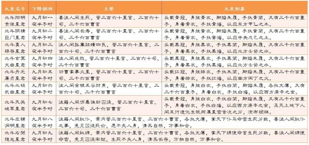 据《太上北斗二十八章经》载,若人至九月九日夜半子时,自身合家清斋行道,清洁素裳冠履,百和名香砂素表章,奏拜三三之次,各随愿所陈披宣,北斗七元君在七元宫中端目视之,天宫金阙门下,有左右年值月值日值时值天一真官、天官值事,获时与此人合奏何事,披露何言,疾速判断善恶,定其分数,生人增加寿算,福禄自然,子子孙孙,代代相承,亡者生天,出离苦趣,受生善道。九皇诞期间,朝拜九皇的时辰和九皇的形象如下表: