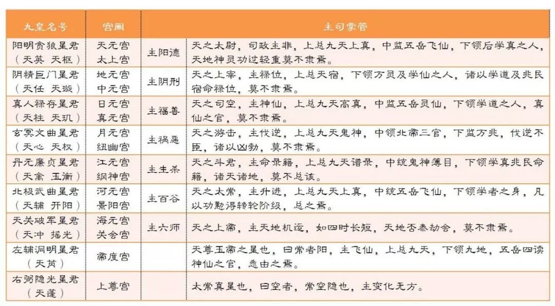 据《先天神后斗姆元尊大道九皇真经》载,斗姆天尊一团神炁,三次超脱,为生圣嗣九真,天英、天任、天柱、天心、天禽、天辅、天冲、天芮、天蓬,是为九子,皇号九皇。诸子洎壮冠乃各修,圆地功行俱满,白昼冲天受得三清贵职。九皇群季分治九州,称居方氏,仁风灏荡,普惠群生。九皇升举,子母同居。北斗九皇在道教尊文“中天大圣北斗九皇九真延生解厄上道星君”等,居垣下北斗九皇宫。北斗七元君在道教尊为“中天大圣北斗七元延生星君”,居垣下北斗旋玑宫。与东斗延生益禄天尊、西斗特玄体道天尊、中斗中灵无极天尊、南斗阳明普度天尊合称“五方五宿五斗星君”、“中天五斗高上玄元扶危救苦延生保命天尊”等,居垣下五极星宫。其中,北斗九皇名号、宫阙、掌管介绍如下: