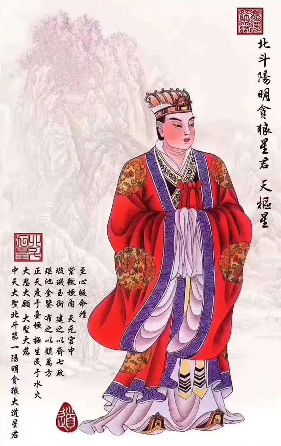 北斗第一阳明贪狼太星君、天枢星,子生人属之。五行为水木,化桃花煞,主福祸,保身续寿,永亨利贞。耳目开爽,魂魄长宁。摄养精神,与神同明。延寿自然,上升玉清。阳明星,天之太尉,司政纠非,上总九天上真,中监五岳飞仙,下领修身之人,天地神灵功过轻重,莫不隶焉。