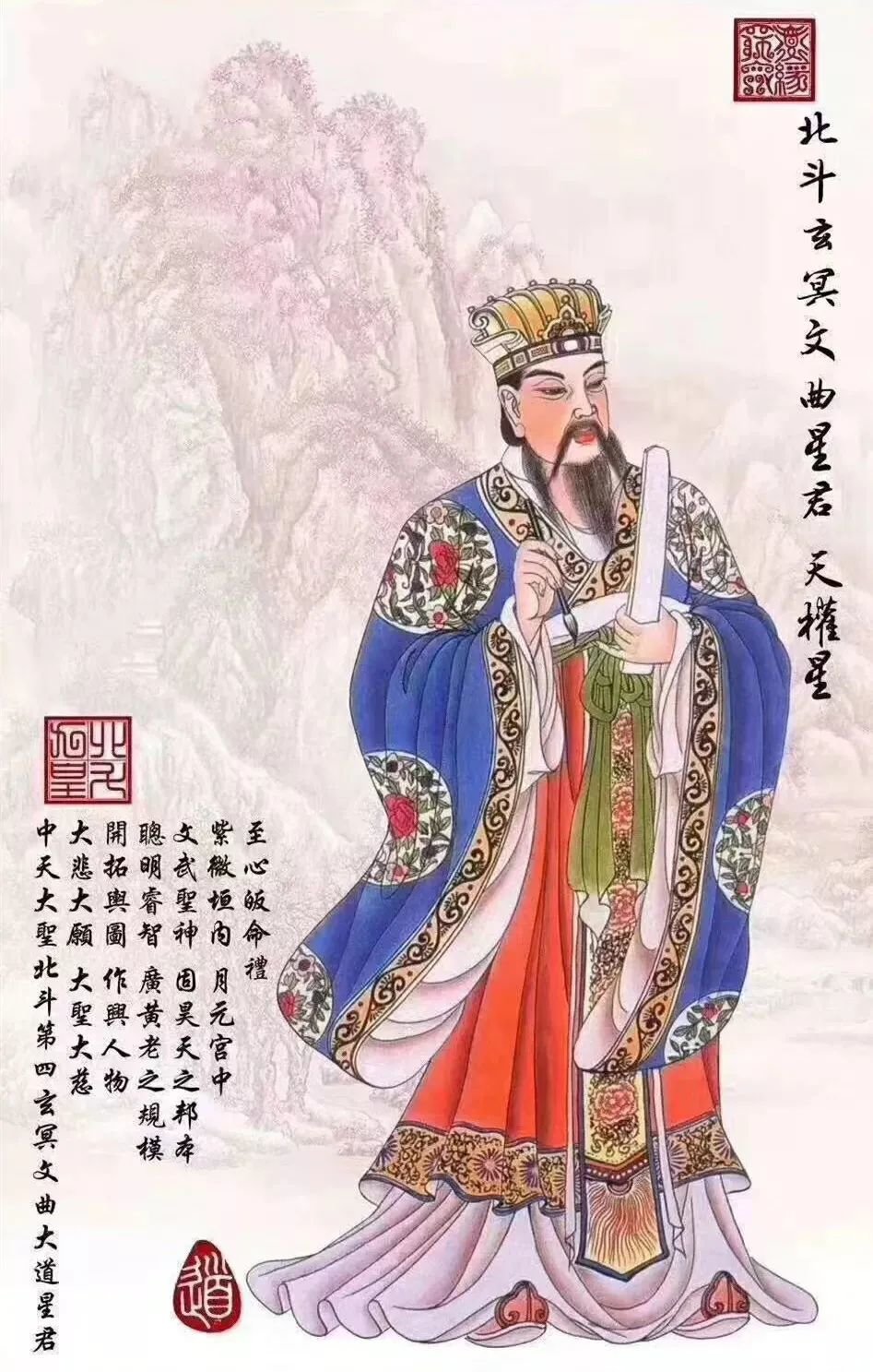北斗第四玄冥文曲星君、天权星,五行为癸水。卯酉生人属之。卫身聪慧,高玄五明。文运自然,与神同荣。玄冥星,天之游击,主文德,科甲,文运,功名上德九天谱禄,中领鬼神簿目,下监勤学命籍,伐逆不臣,诸天诸地,莫不隶焉。