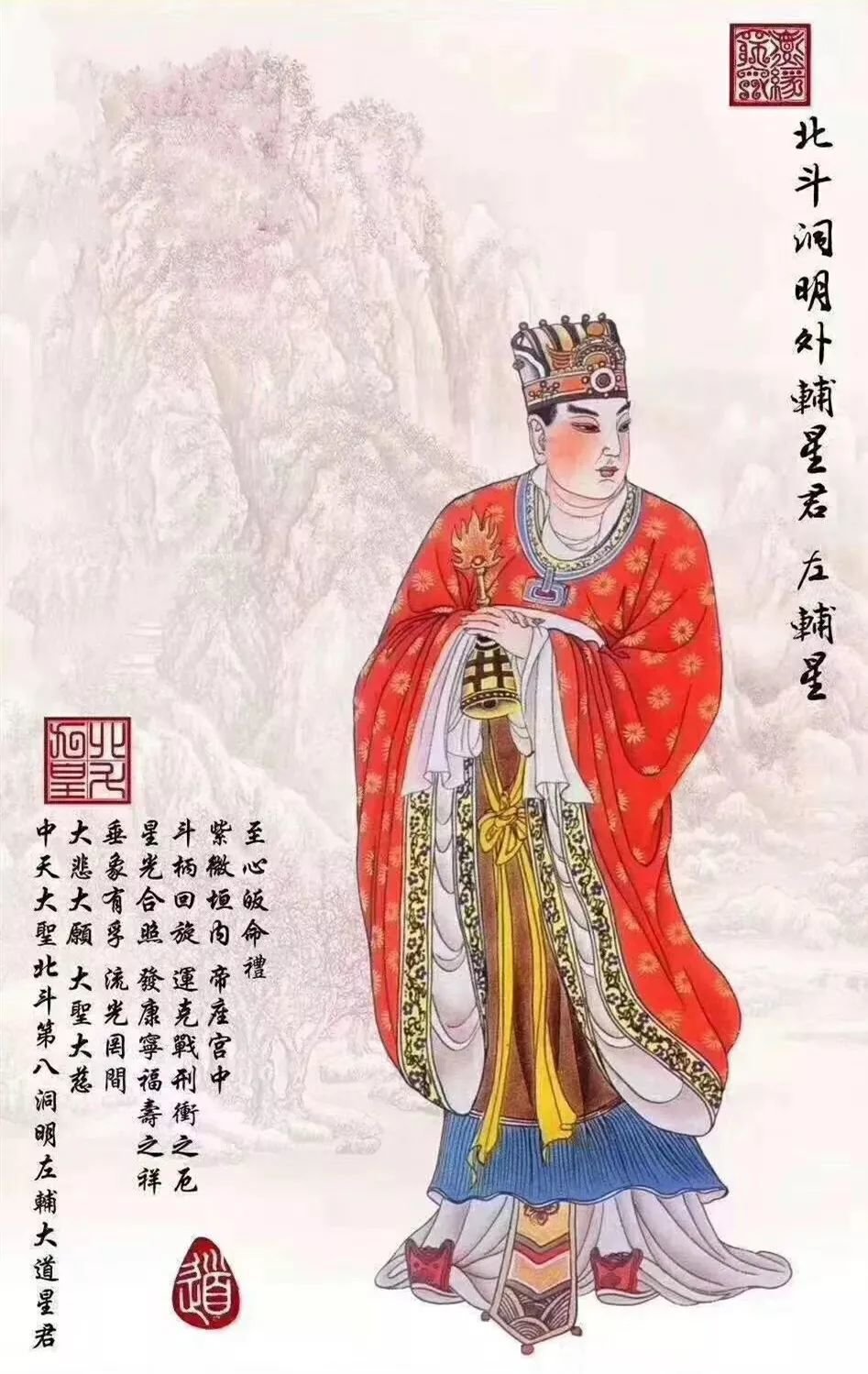 北斗第八左辅洞明星君。辅星如人间卿相,天尊玉帝之星也,主天医飞仙,上总九天,下领九地,五岳四渎神仙之官,悉由之焉。辅在武曲星之外傍,帝化日月水火。至心皈命礼。
