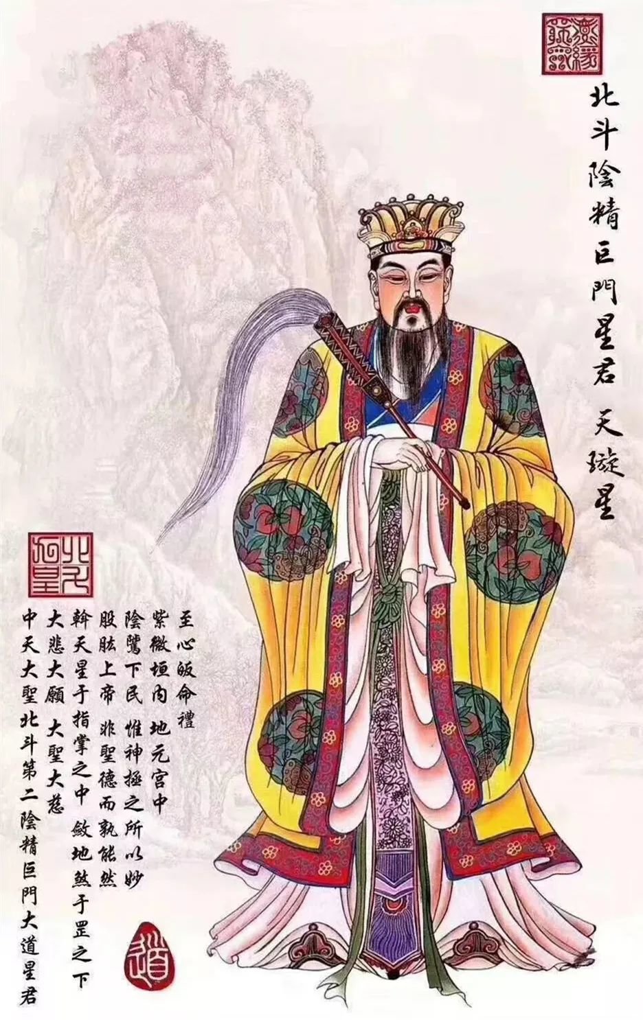 北斗第二阴精巨门元星君、天璇星,丑亥生人属之。结福护身,福庆维新。辟除妖恶,善瑞日臻;去来无碍,与神同轮。福命自然,上升玉宸。阴精星,天之上宰,主保命,上总天宿,下领万灵及惜福之人,诸以奉道及兆民福庆,莫不隶焉。
