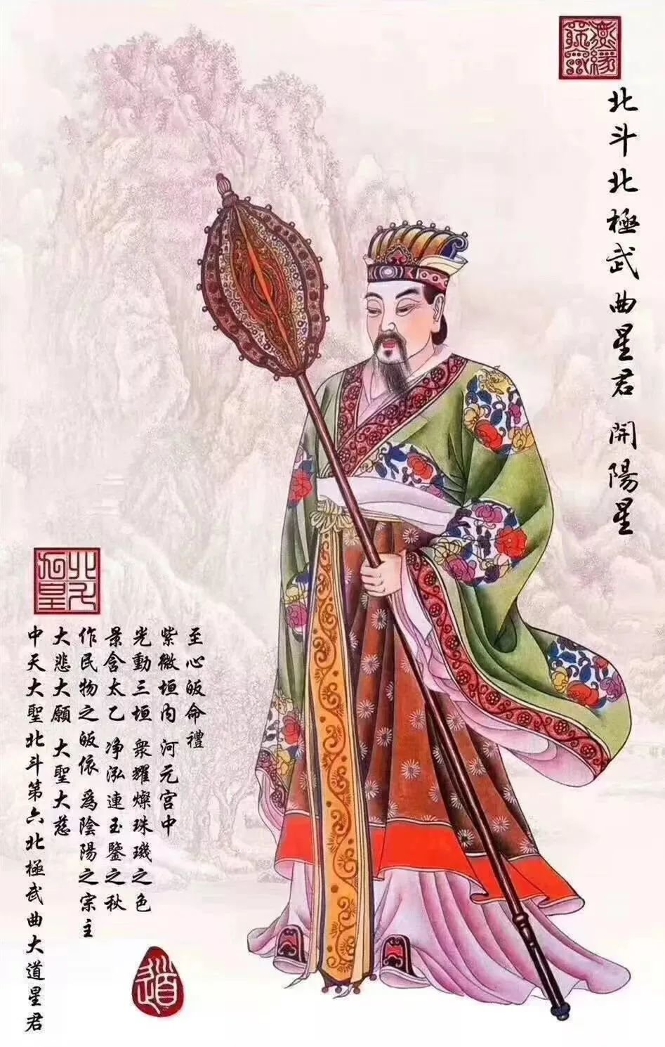 北斗第六北极武曲星君、开阳星,五行为辛金,巳未生人属之。化气为财,为财帛宫主,成为财富之神,司掌财富、武勇。爵位荣身,享福无穷。仙官扶卫,步摄云中。正真降集,与神同职。威灵备守,妖邪绝踪。仕途自然,上升玉宫。北极星,天之太常,主升进,上总九天上真,中统五岳飞仙,下领求职之人,凡以功勤得转轮阶级,总之焉。