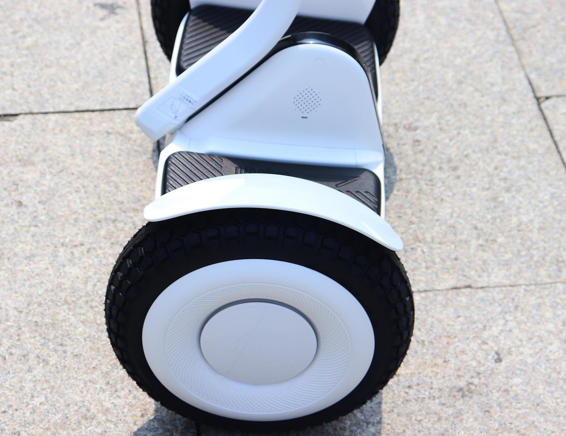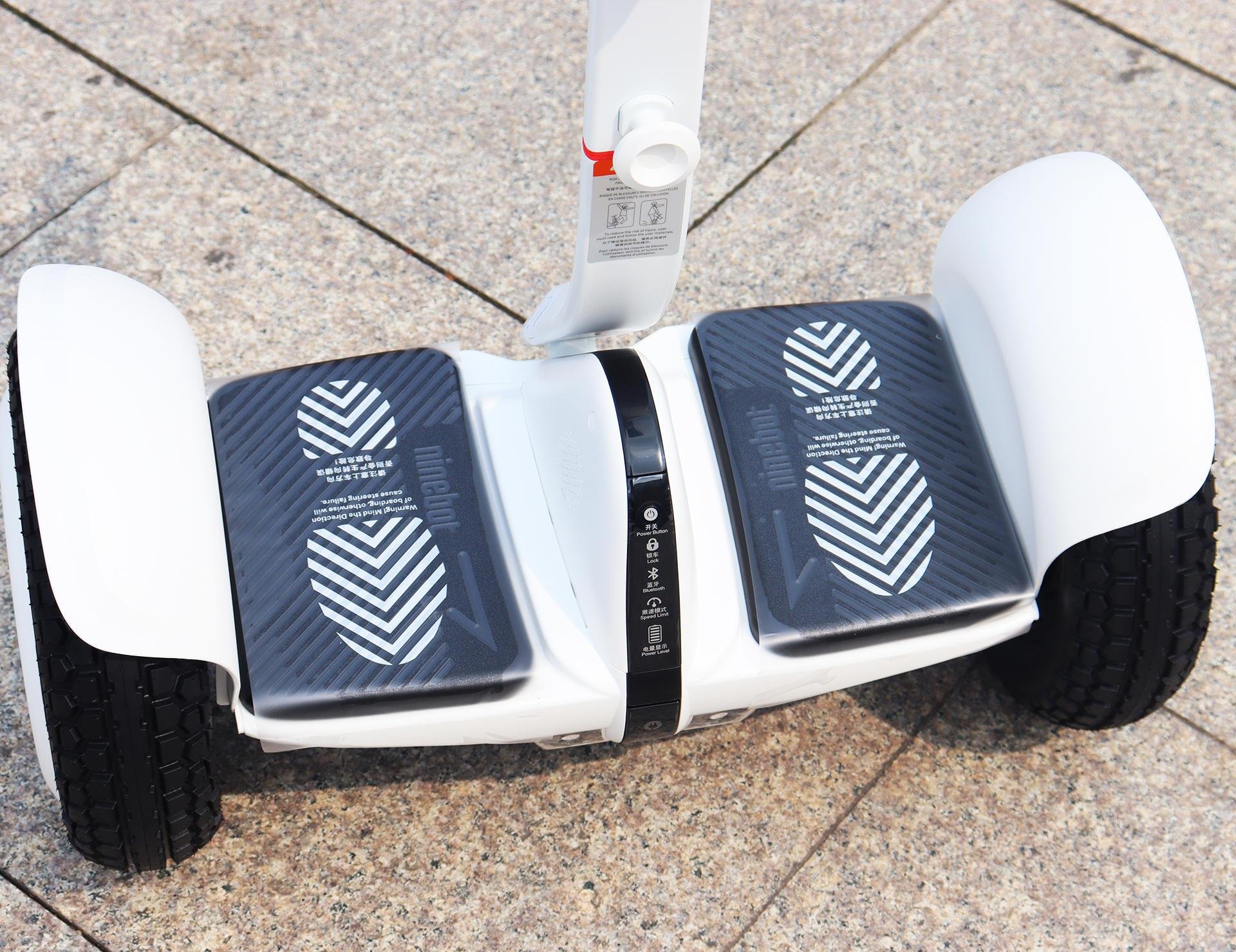 这款新品的配色有两种,有白与黑双色可选,我入手的是白色款,白色的颜值非常在线,也很有九号平衡车的设计特点,区别于市面上的其它平衡车外观,流线型的设计非常好看,细节处理上也做的更到位,轮胎采用10.5英寸高弹真空越野胎可以让行驶更稳定。整体的机身车架和轮毂采用超轻航空级镁合金,保证了机身的强度和架构,可以让最大载重 200 斤满足了大部分成年人的承载需求。家里不管是男人还是女人或者小孩都可以骑行体验。双脚踩踏部位使用了完整的两块大面积软硅胶垫,条纹形表面防滑拥有不错的吸附性,站在车上不会因为湿滑和颠簸移动身体,稳固性较好。