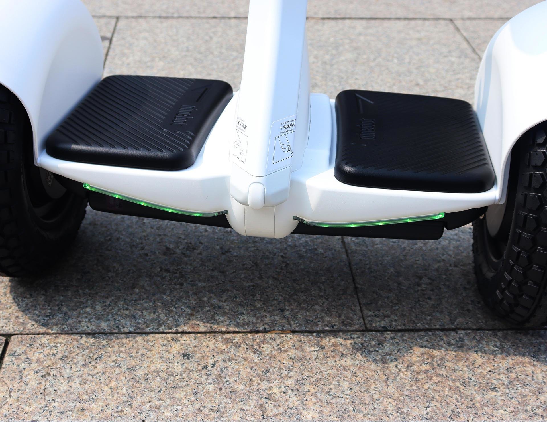 机身的正前方是开关按键以及充电接口,还有两颗前大灯,保证了晚上骑行的时候安全行驶,值得一说的是在开关按键下面有一块LED显示屏,开机后即可随时观察电量、音乐模式、蓝牙连接等,方便查看到平衡车的状态。对比一般普通的平衡车这个设计真的非常人性化。