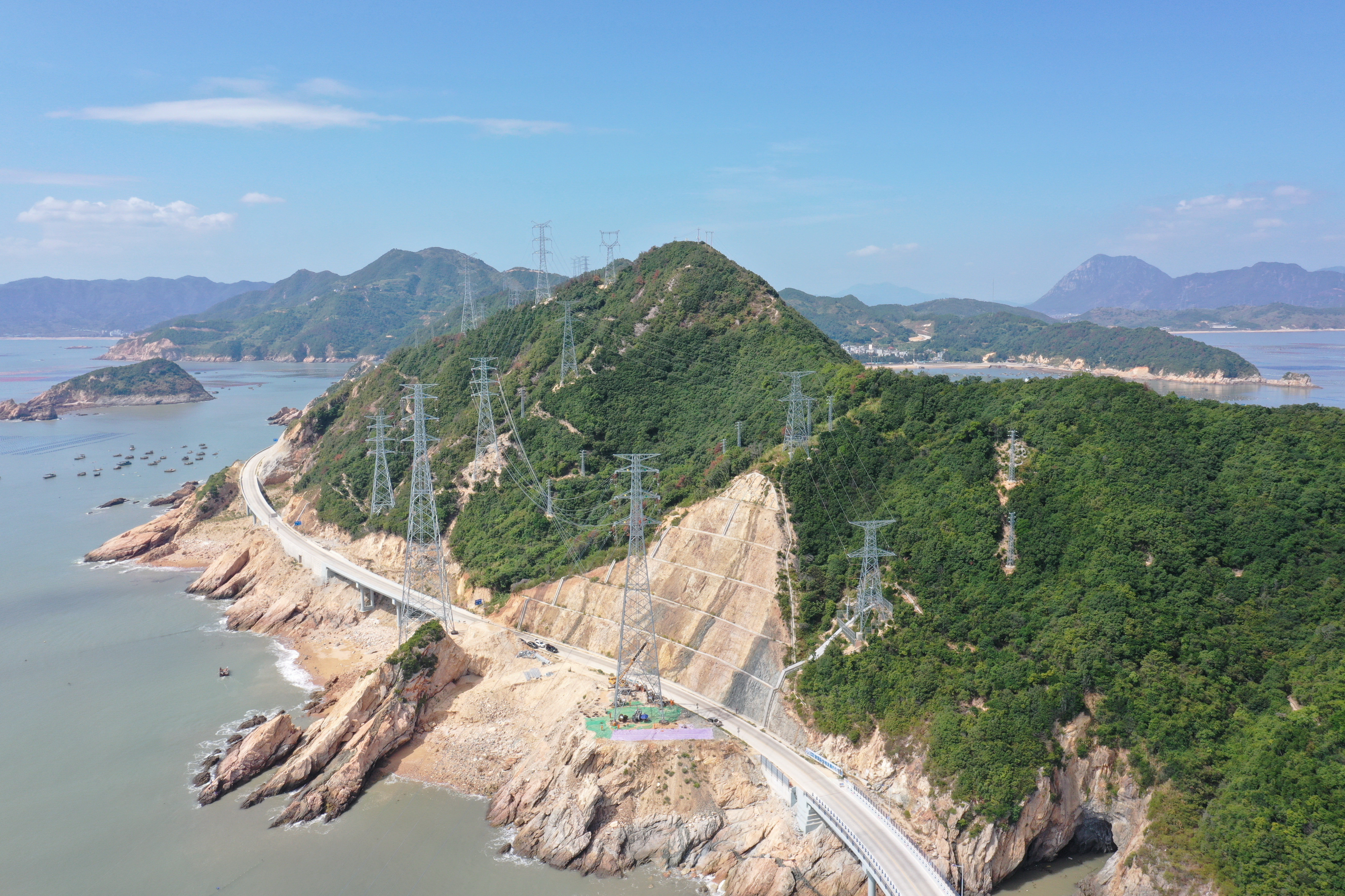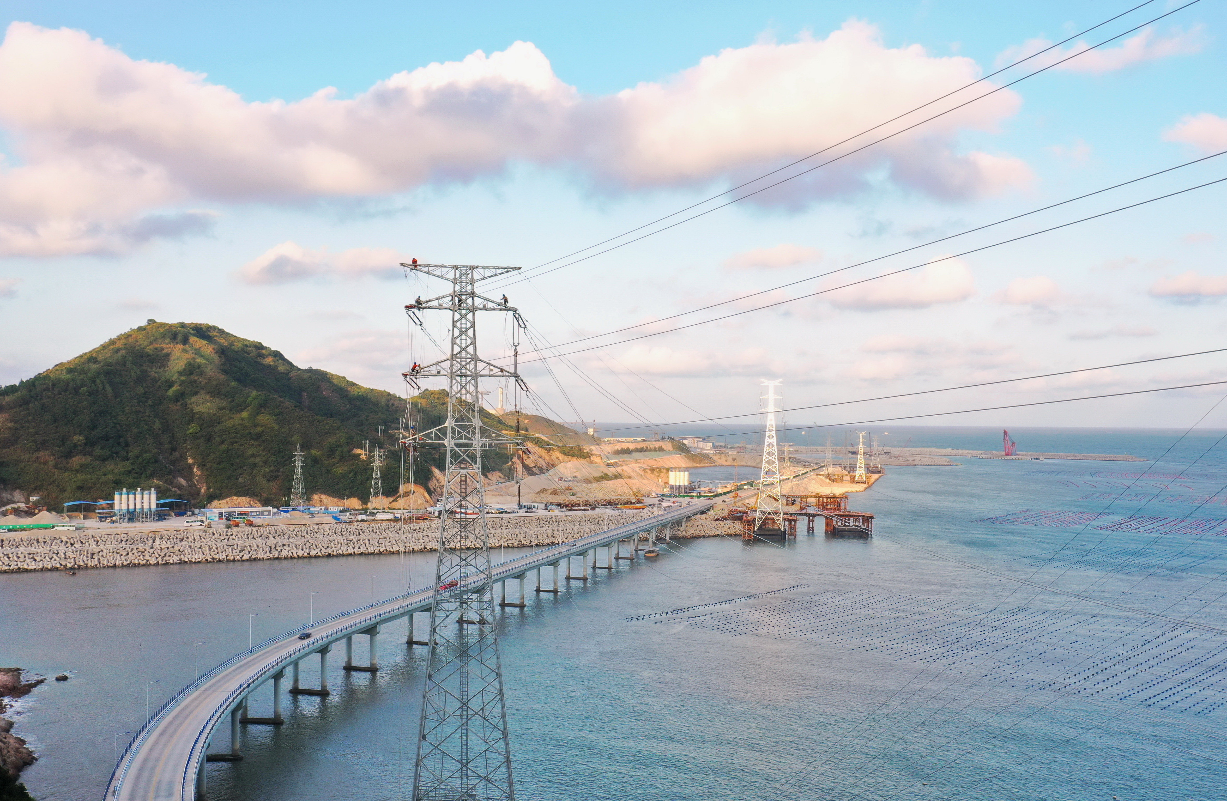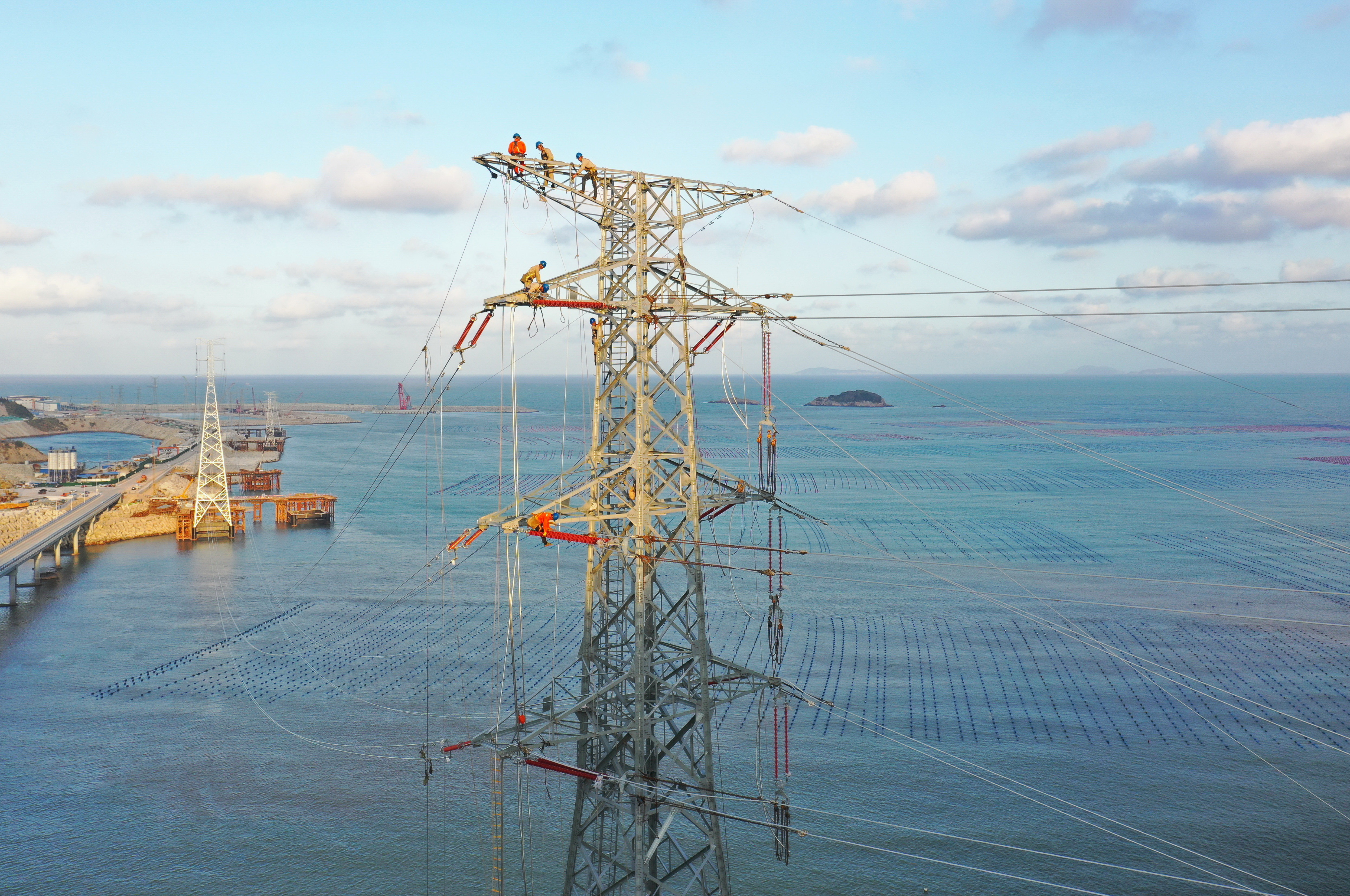 9月21日,国网福建省送变电工程有限公司施工人员在宁德市霞浦县的B7塔处架线施工。新华社记者 林善传 摄