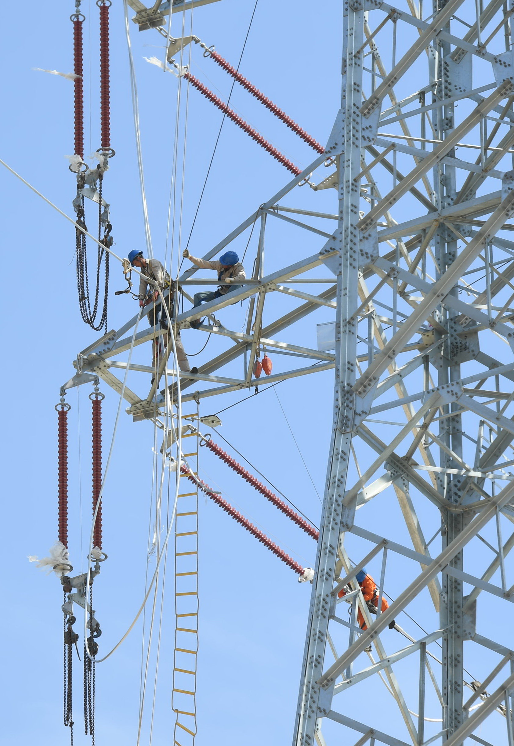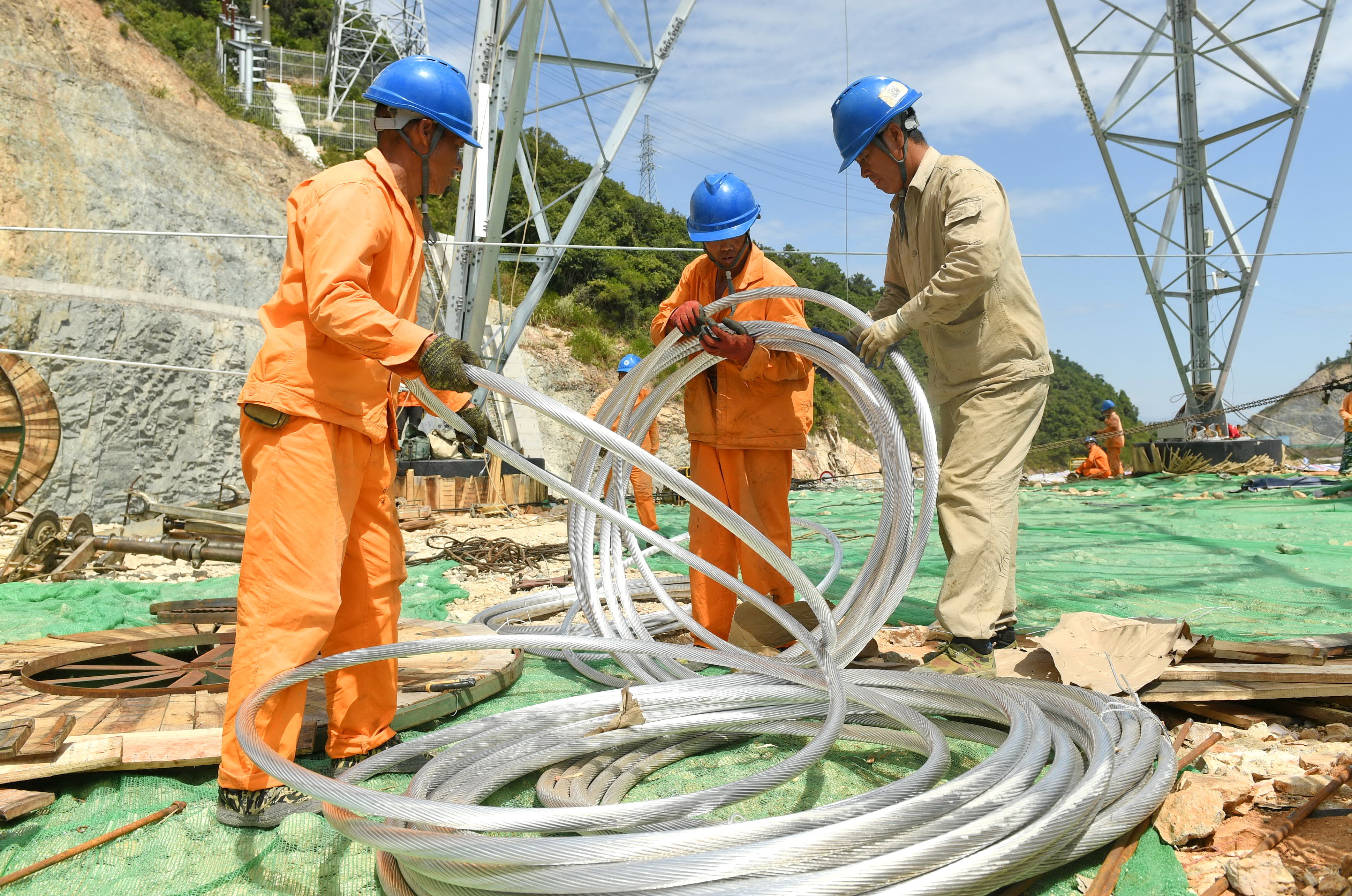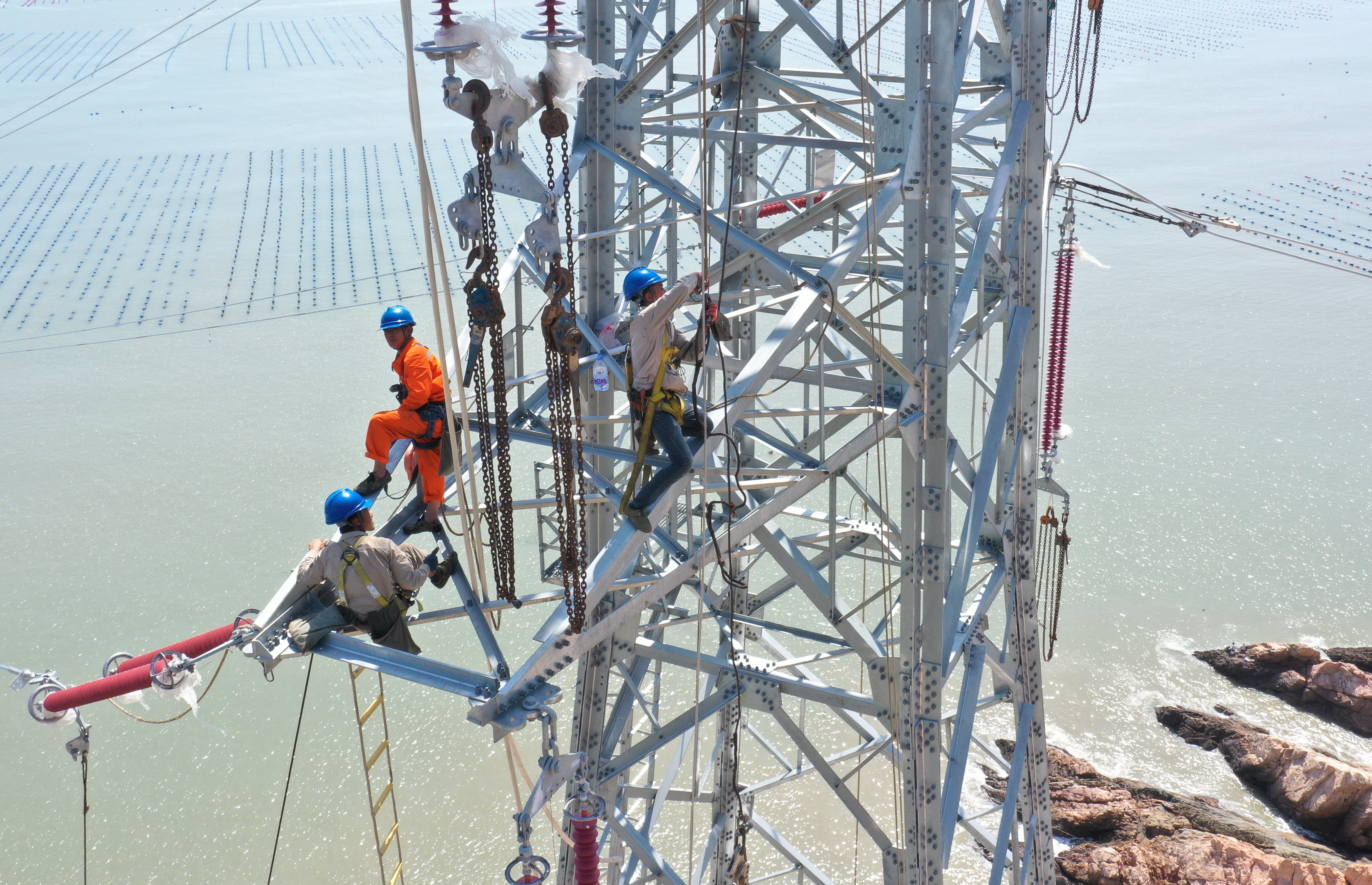 9月21日,国网福建省送变电工程有限公司施工人员在宁德市霞浦县的B7塔处架线施工。新华社记者 林善传 摄