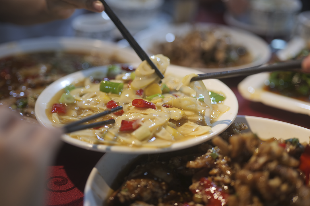 没有人让排行,@彭主任 主动跳出来给肚片颁奖,“我喜欢”,注意观察他的挑菜轨迹,每一道热菜后必有一口肚片。