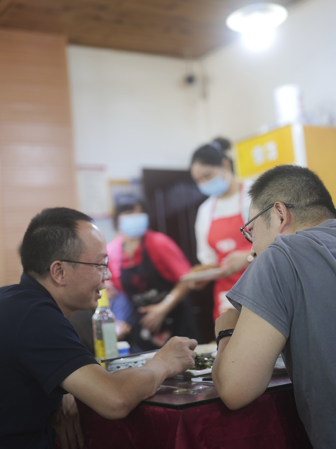 我们被安排在一个方桌上,桌子都没抹干净,一群人就一屁股坐下生怕被抢走,抬板凳的抬板凳,又眼疾手快跑到篮框里添餐具。