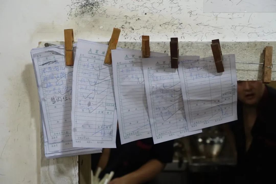 简直是老古董,以前小时候夹蚊帐用的木头夹子,有的已经被摸得黢黑,菜单吊在空中,一直保留着那二年辰的风采。