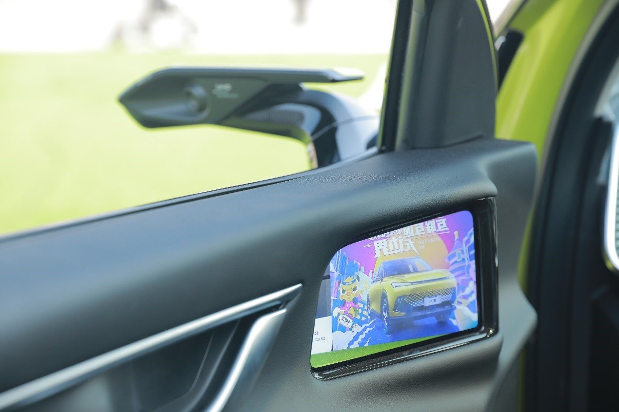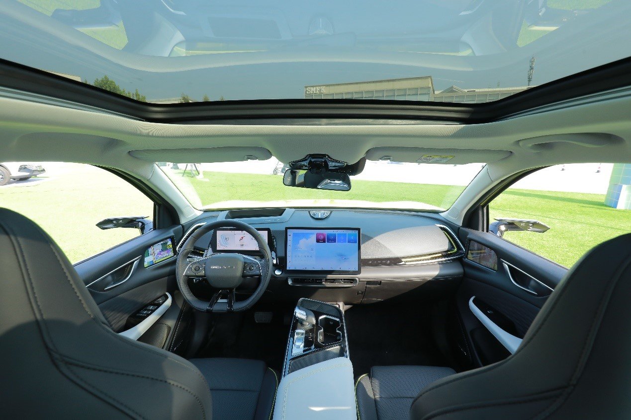 打开车门,一股科技风映入眼帘。内饰延续了外观的未来科幻风,空调出风口很像科幻电影里星球战舰的机翼。说到智能座舱,那我们先来一一盘点一下,首先是驾驶员面前的60英寸AR-HUD,从数字上我们就可以感受它的实力。其次,就是自主品牌车型首次加入了高清外后视镜,这与之前奥迪e-tron上的功能相同,也是非常值得期待的配置。再次就是中控屏中360°全景影像及透明底盘功能,同时还搭载了循迹倒车功能。接下来我们就具体讲解一下。