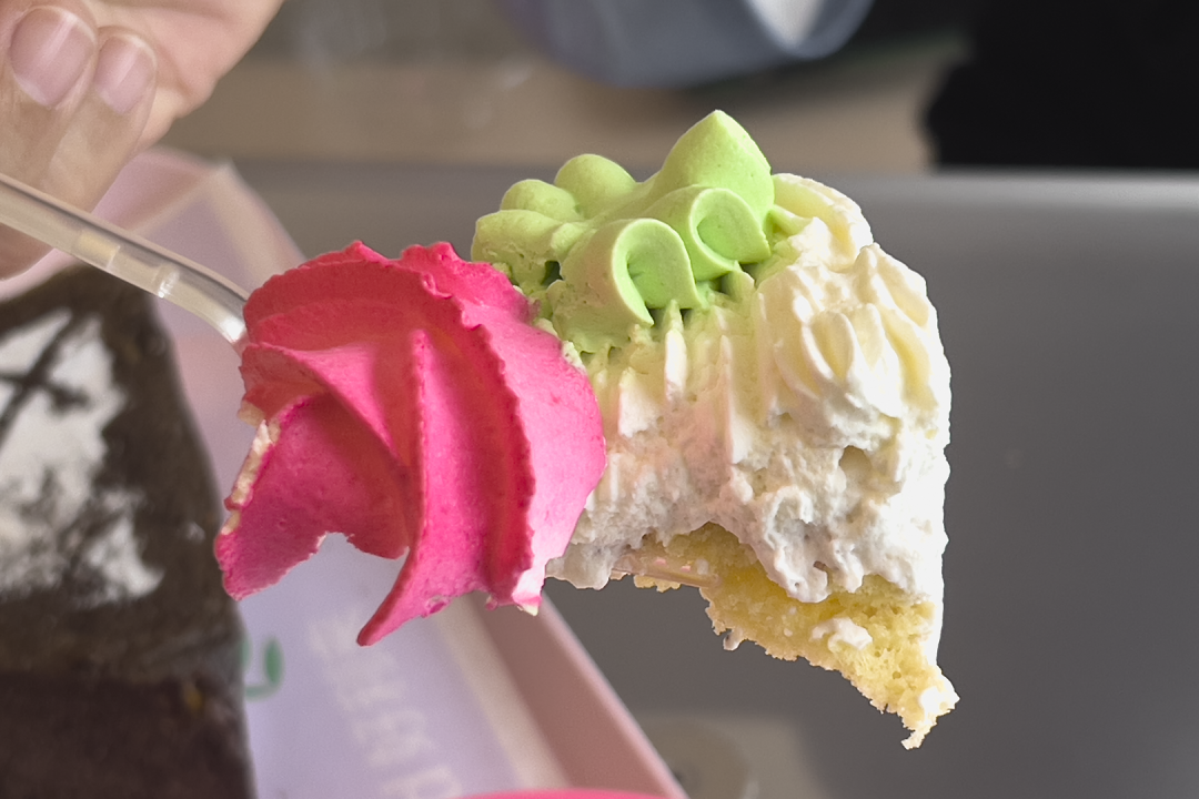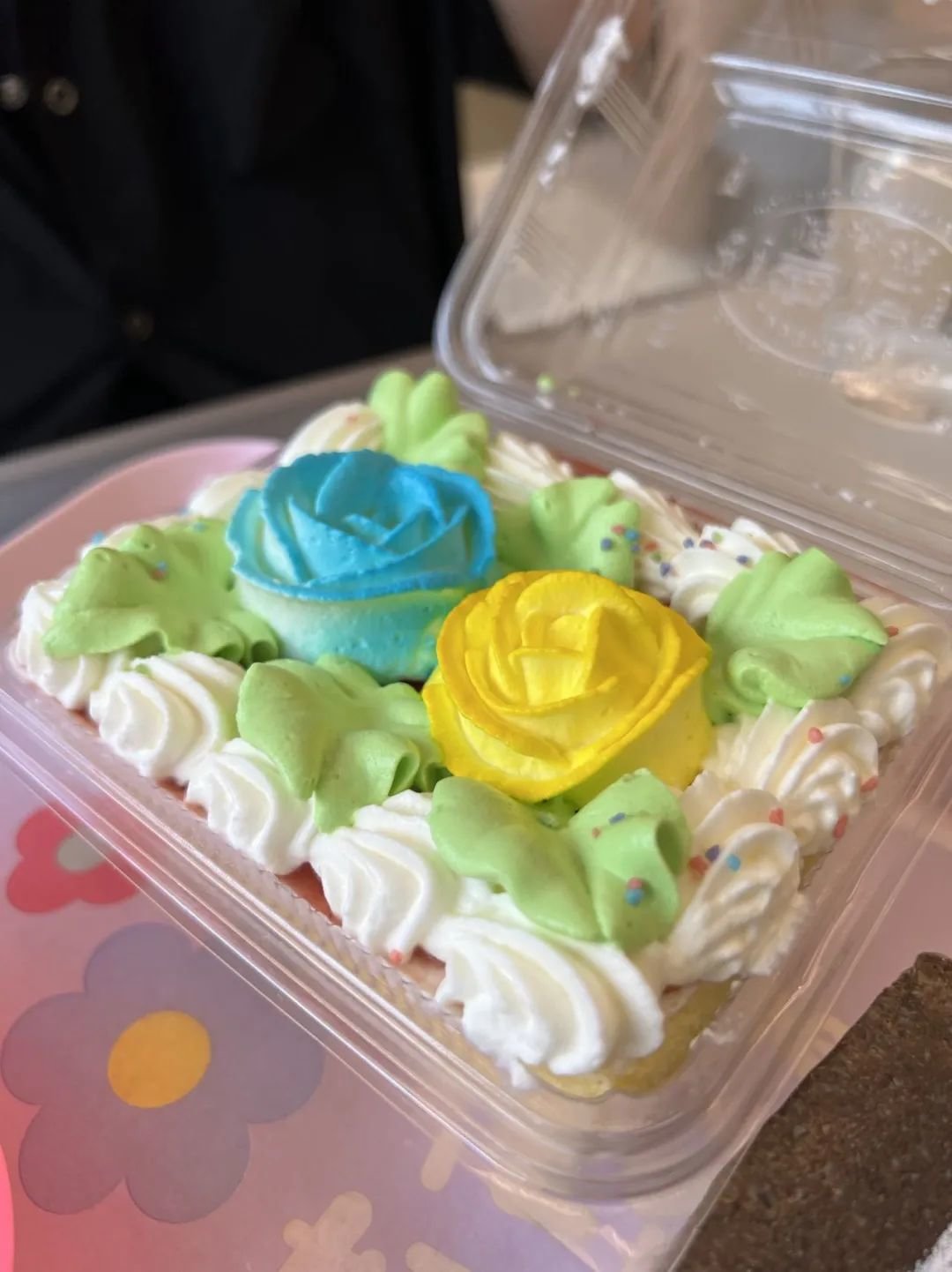 相比于花篮款,便当里的蛋糕部分比较有存在感,然后奶油与蛋糕之间铺了一层果酱,有一点酸感,在香甜之中乱窜。