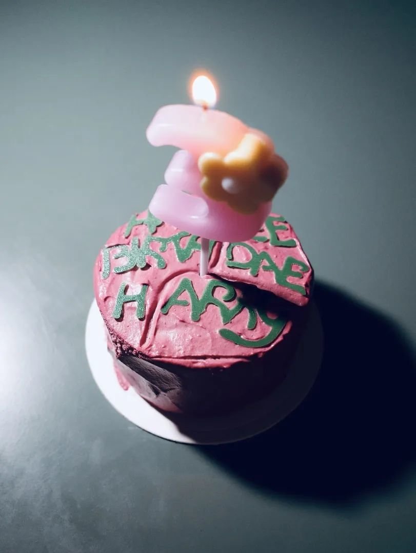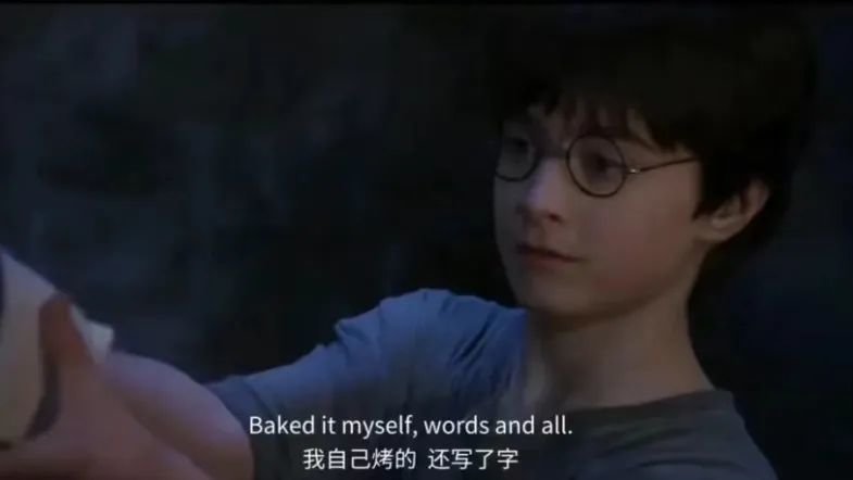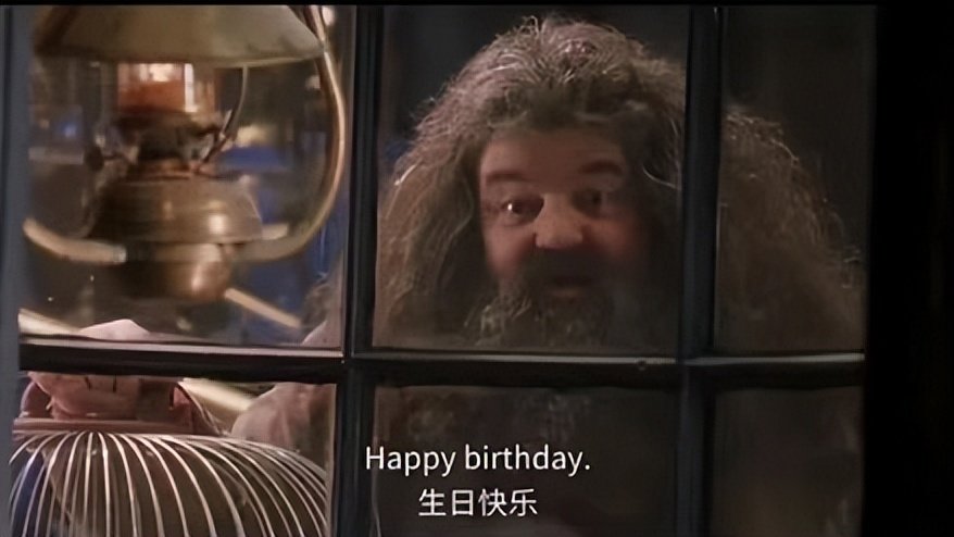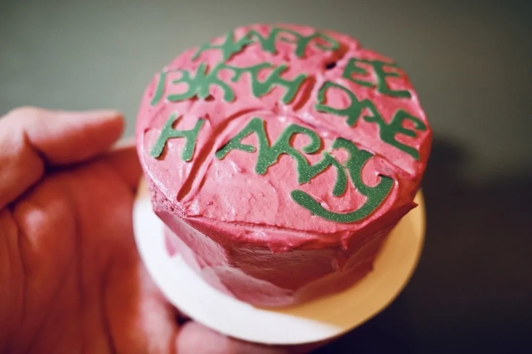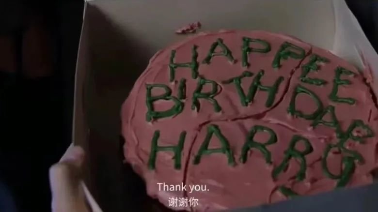 哈利十一岁生日,海格给他做的蛋糕,因为揣在大衣兜里,所以有裂纹,也因为海格的拼写不好,英文有点错误。