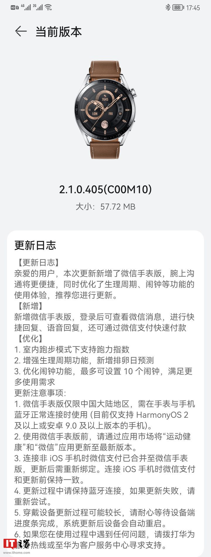 IT之家 9 月 22 日消息,据网友反馈,华为 WATCH GT 3 手表已开始推送 2.1.0.405 (C00M10) 更新,下载包大小为 57.72 MB,更新日志显示,本次新增了微信手表版,腕上沟通将更便捷,同时优化了生理周期、闹钟等功能使用体验,推荐进行更新。