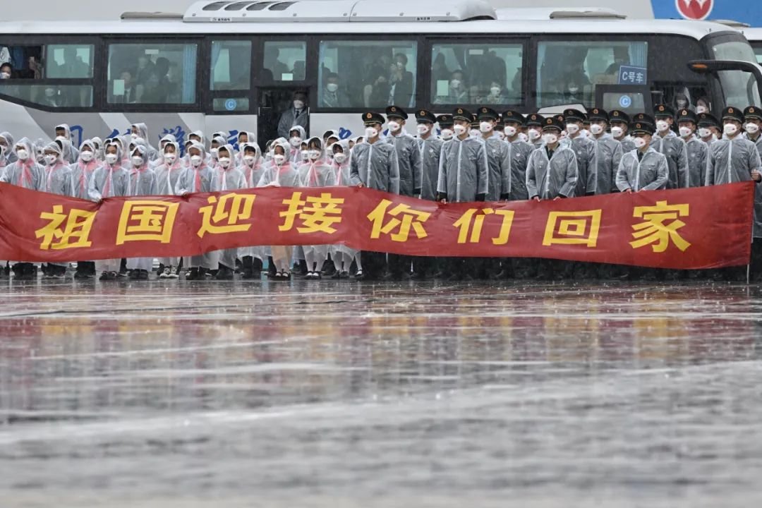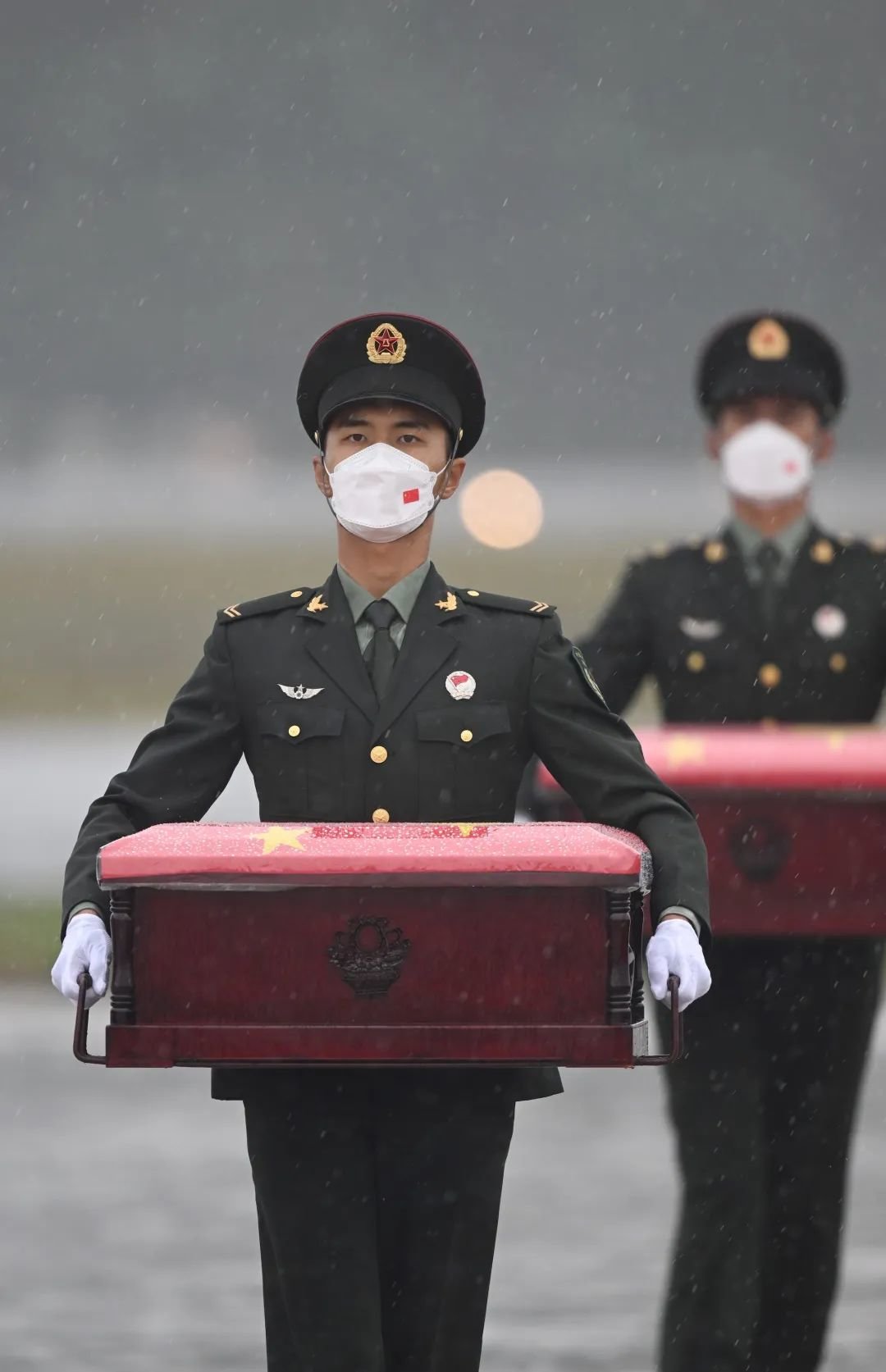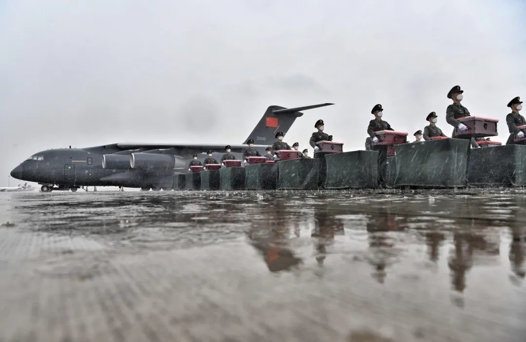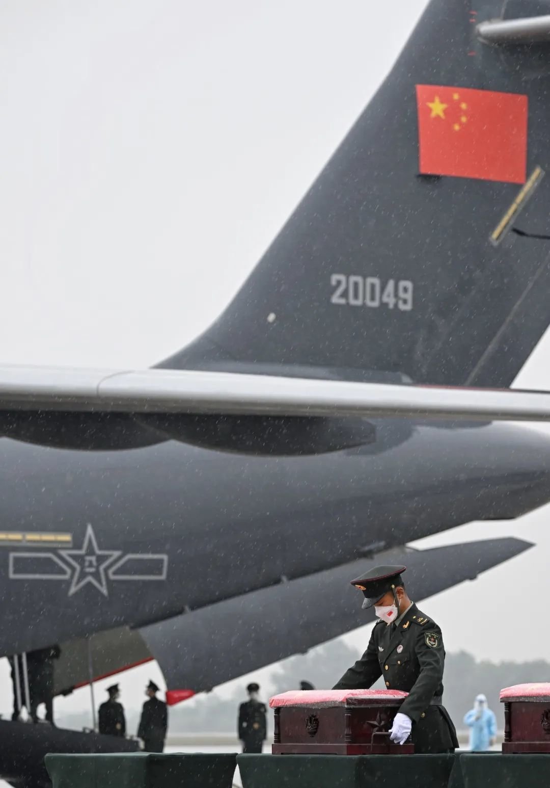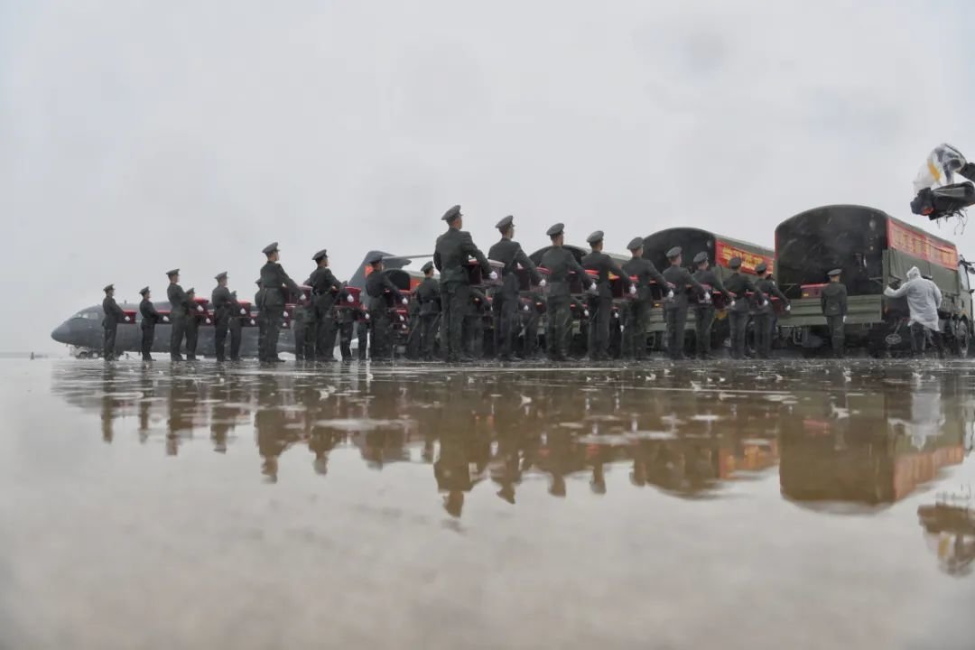 之后,在沈阳桃仙机场举行了志愿军烈士遗骸迎回仪式。沈阳的上空,突降磅礴的雨水,也寄托着我们对志愿军烈士浓浓的思念。也因降雨,烈士棺椁的整理工作在运-20机舱内进行。