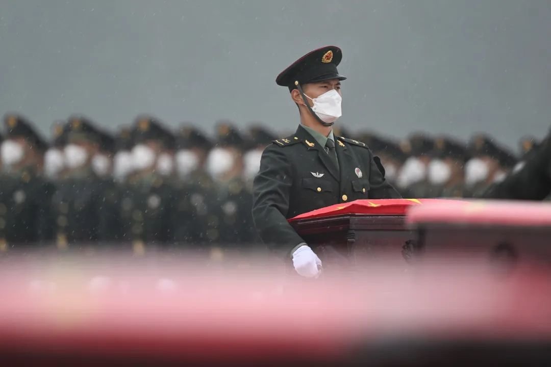 8时30分,第九批在韩中国人民志愿军烈士遗骸交接仪式在韩国仁川国际机场举行。之后,由歼-20为运-20护航,将志愿军烈士遗骸接回祖国。