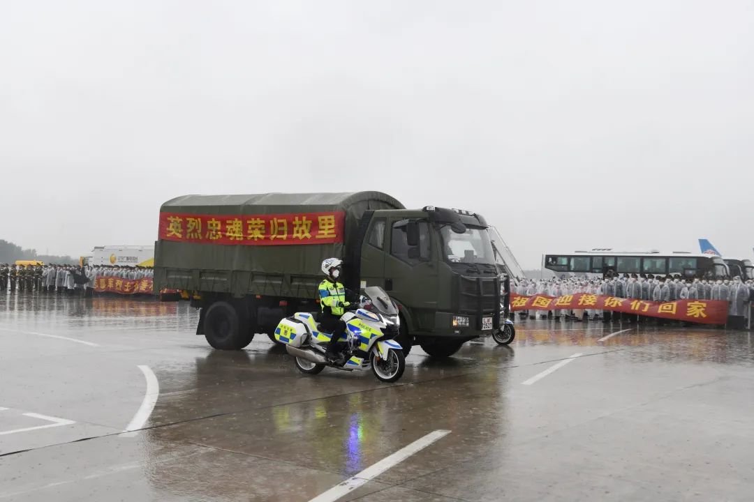 礼兵护送烈士遗骸乘坐军车,离开机场。