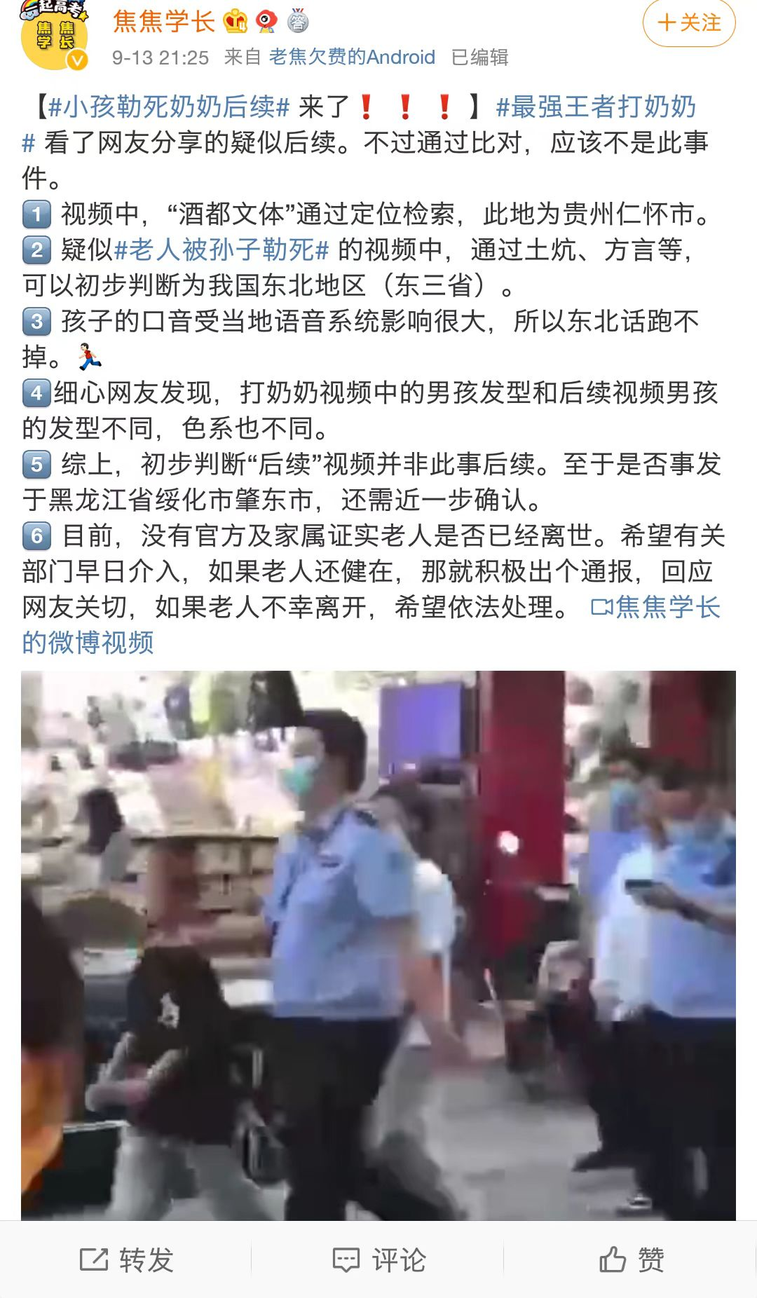 还有流传的后续视频说,“男孩的爸爸向大伯道歉,被大伯锤杀”。
