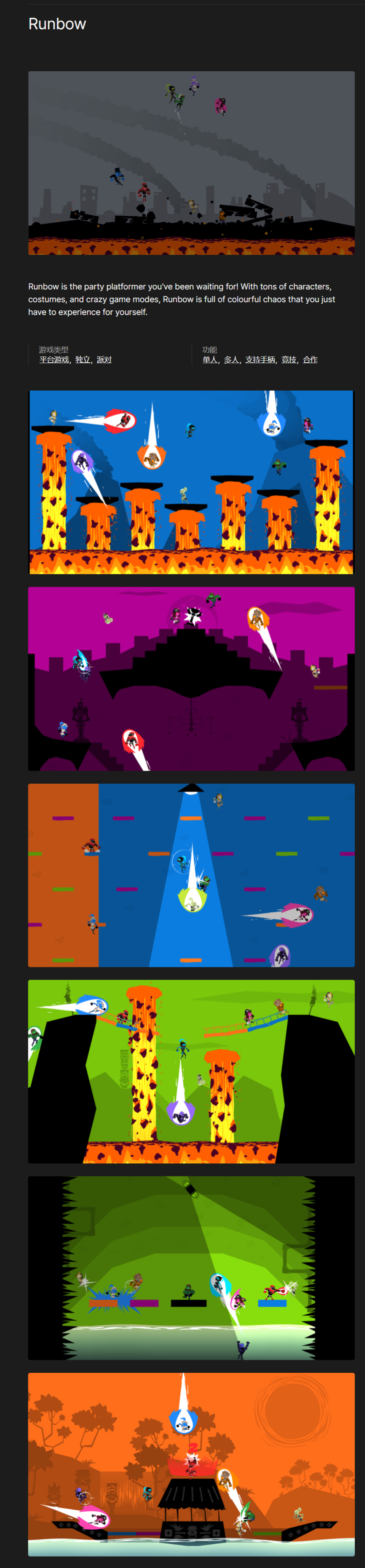还有一款《Runbow》游戏,Runbow 是你一直在等待的派对平台游戏! 拥有大量角色、服装和疯狂的游戏模式,Runbow 充满了多彩的混乱,你只需要亲身体验。