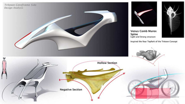 根据雅马哈的说法,Tritown的框架和所有其他组件均采用有机形状设计,这是“仿生学”设计方法的结果,其设计原理是参照自然界中存在的形式和结构,如鸟的翅膀、鱼的骨头、贝壳。雅马哈称,Tritown的底盘不仅更紧凑、更轻,而且由于在设计中融入了弯曲部件和扭曲结构的框架,因此更坚固。