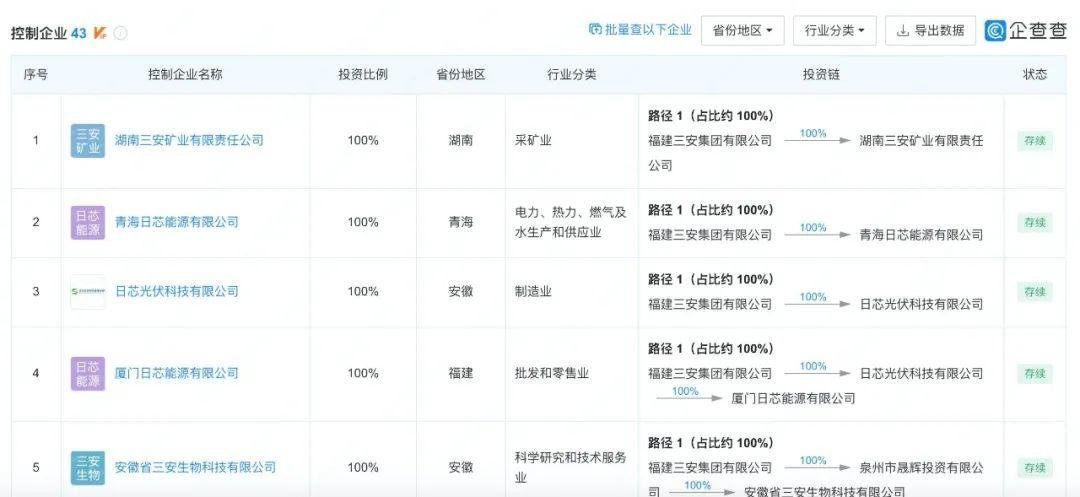 工商信息显示,三安集团直接控股43家企业,间接控股996家。