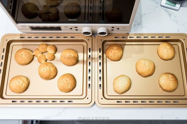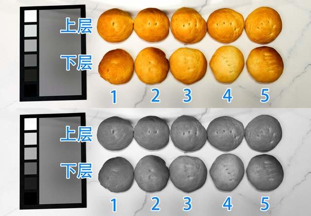上下两层,每层5个面包,烤制面包时温度会有明显的上色现象,温度越高颜色越深,面包的四周颜色分布也能反映均匀性。