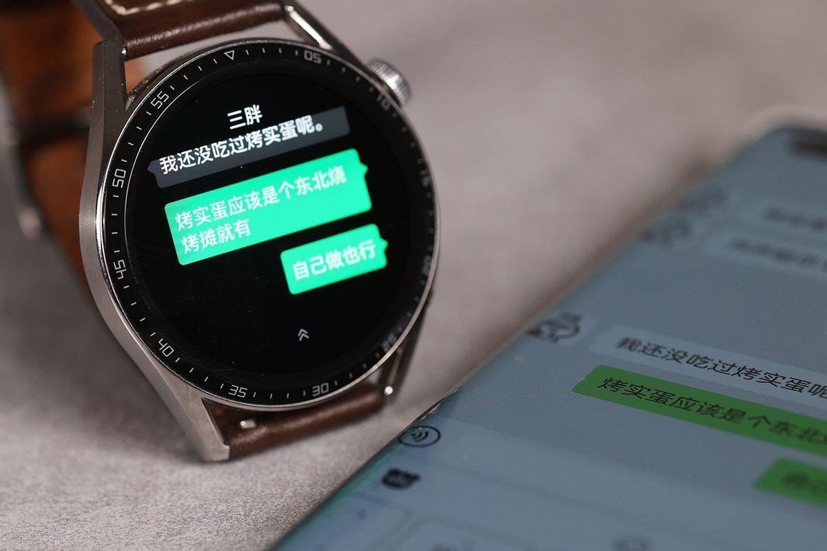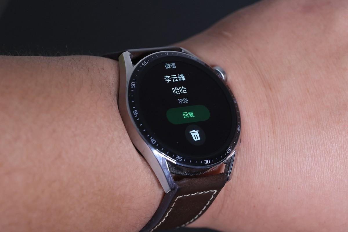安装了微信手表版并登录之后,当再收到微信文字、图片消息时,手表上会直接显示,而且会多一个回复按钮,当点击的时候就能直接进入微信手表版的回复界面。需要注意的是,华为运动健康会默认开启智能提醒功能,当手表检测到佩戴时,收到信息之后手表会振动提醒,手机会静默。这个功能可以关闭掉,仍然让手表和手机同时提醒。
