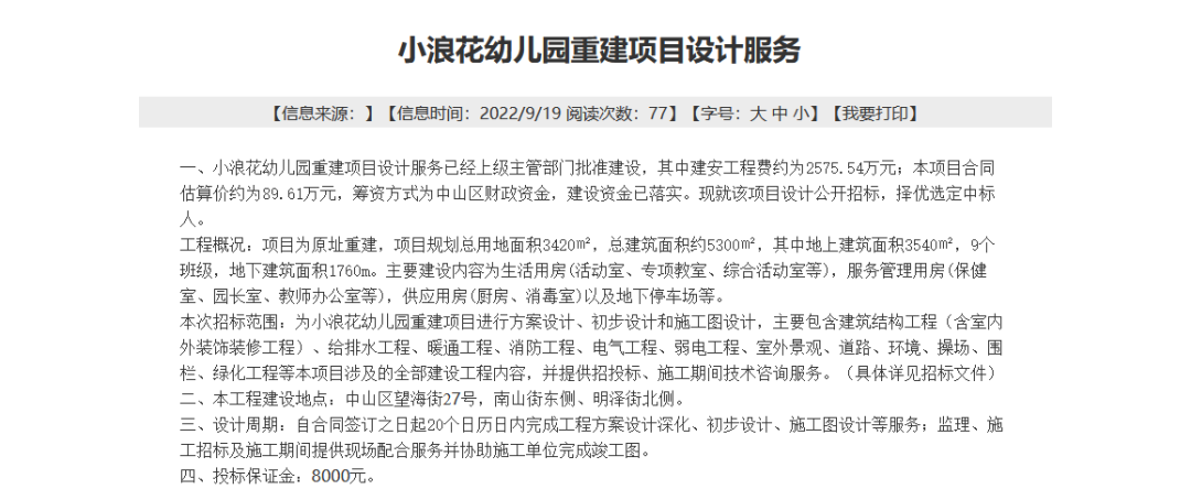 小浪花幼儿园重建项目设计服务正公开招标,招标范围包括小浪花幼儿园重建项目进行方案设计、初步设计和施工图设计,主要包含建筑结构工程(含室内外装饰装修工程)、给排水工程、暖通工程、消防工程、电气工程、弱电工程、室外景观、道路、环境、操场、围栏、绿化工程等本项目涉及的全部建设工程内容,并提供招投标、施工期间技术咨询服务。